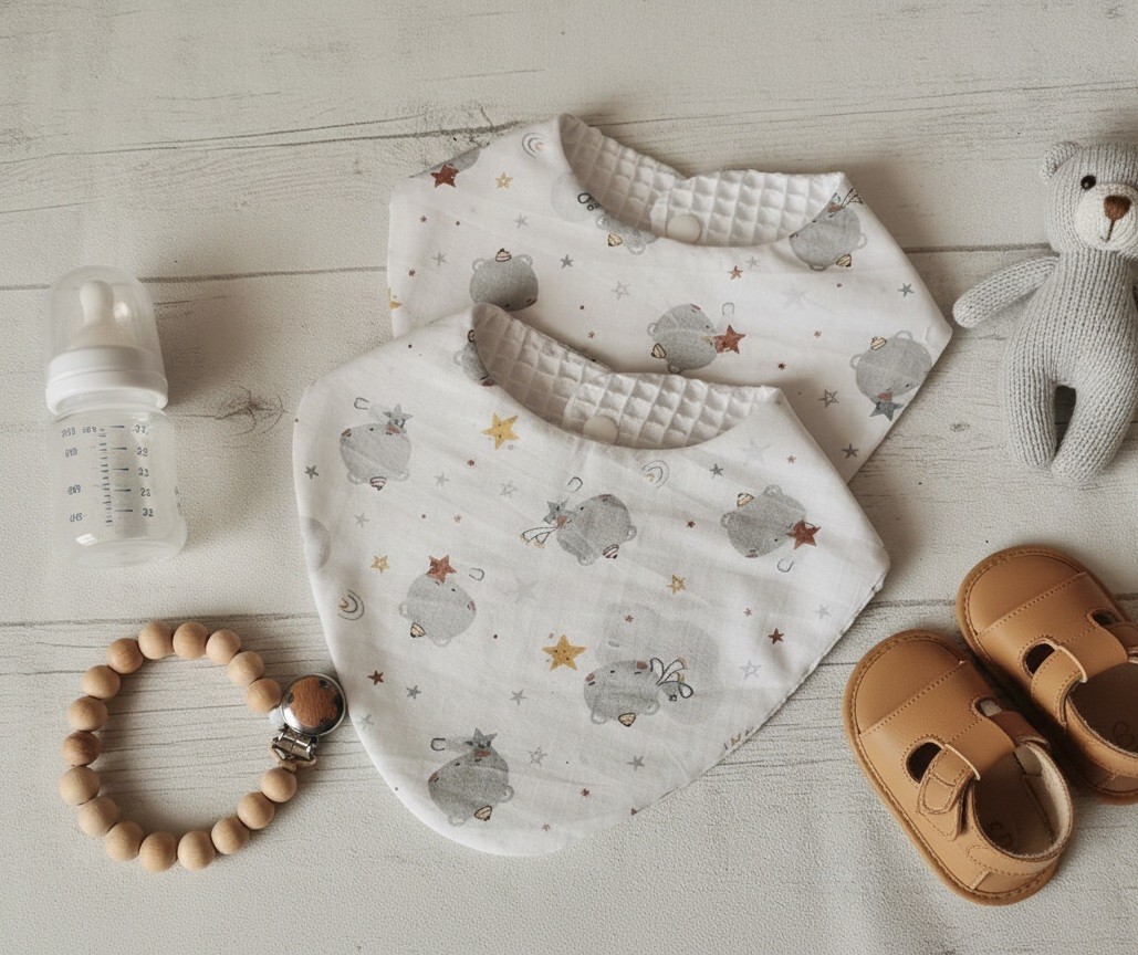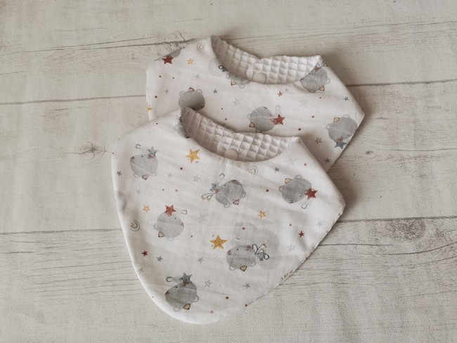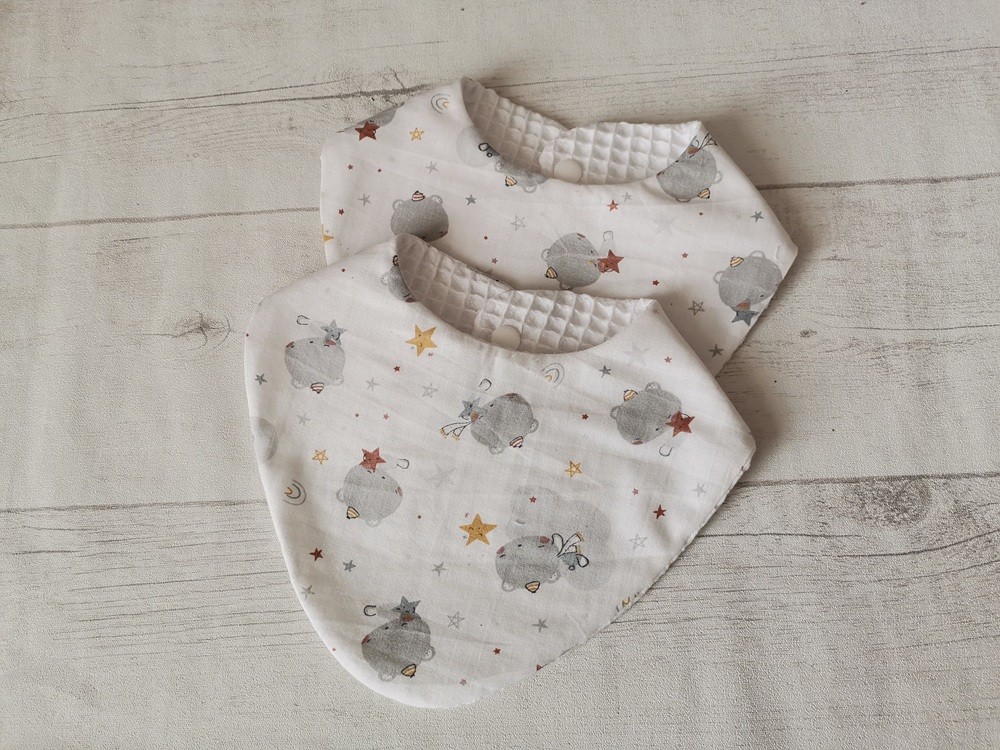 Lot de 2 bavoirs naissance coton imprimé étoiles/animaux et nid d'abeilles blanc