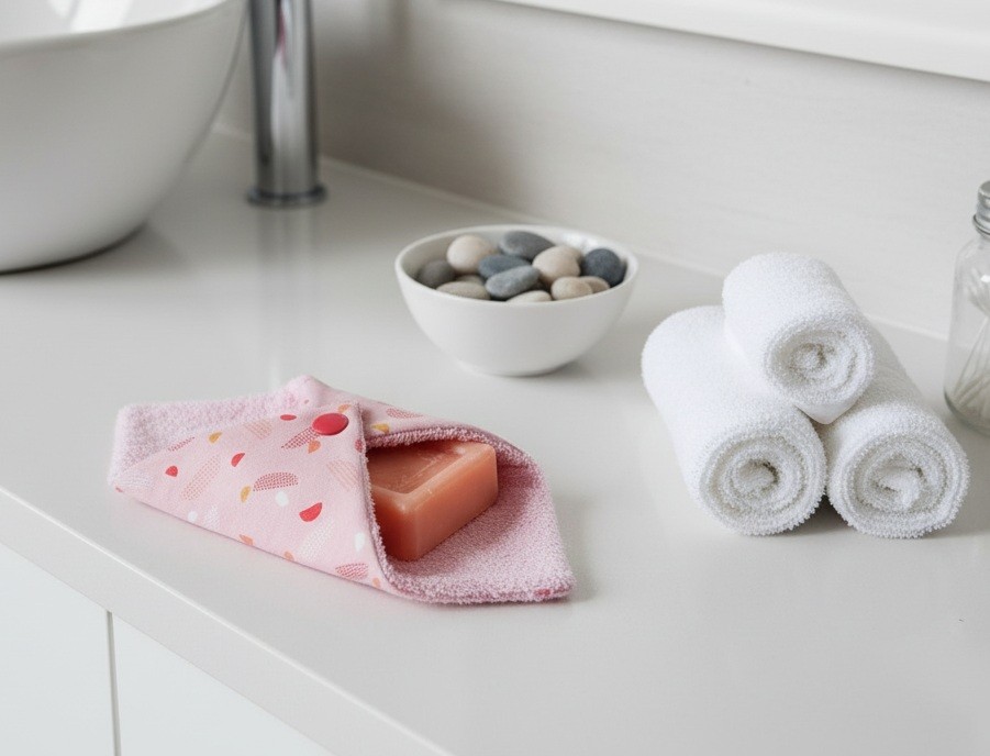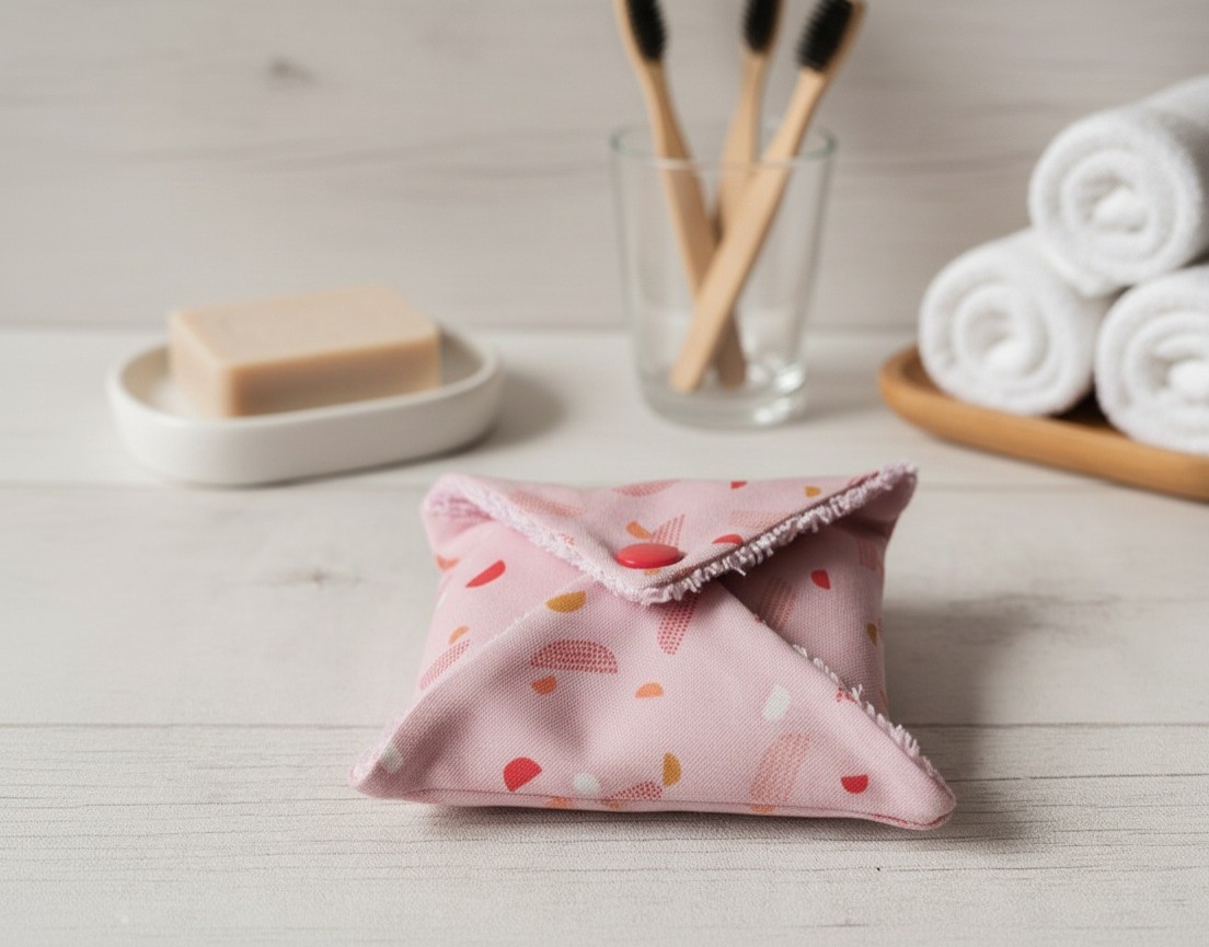 Très jolie pochette à savon ou shampoing solide qui se ferme à l’aide d’un bouton pression.
