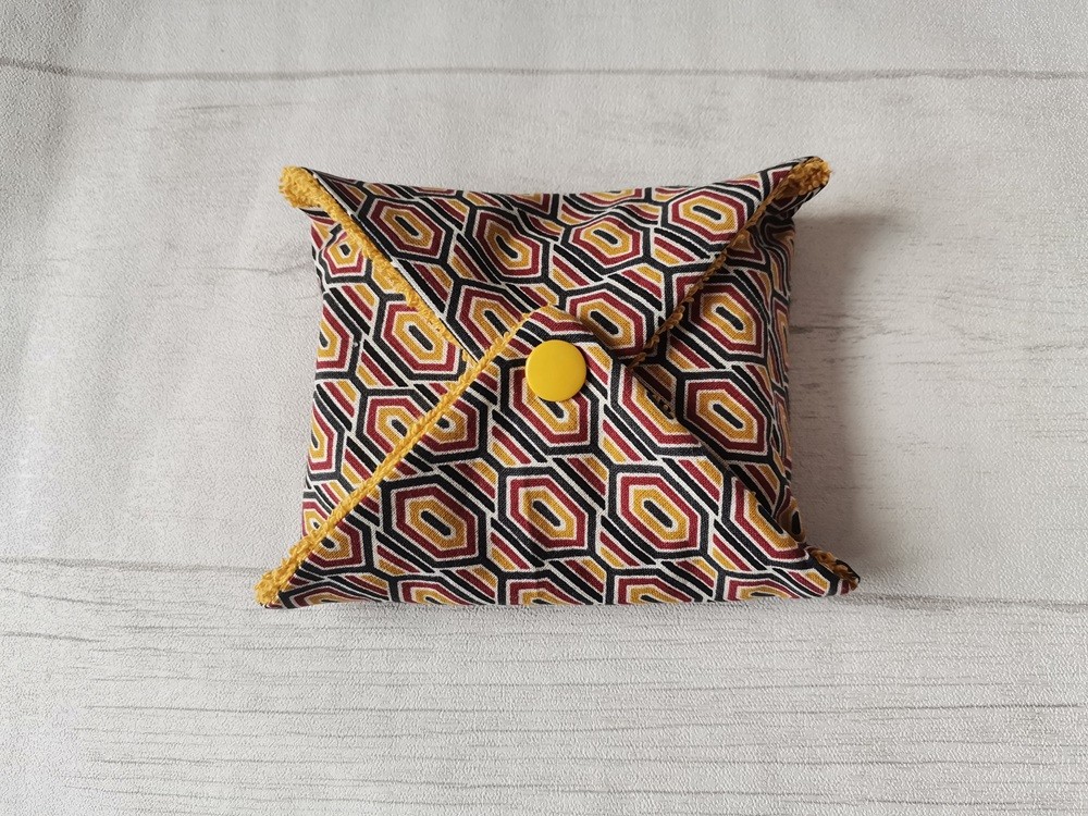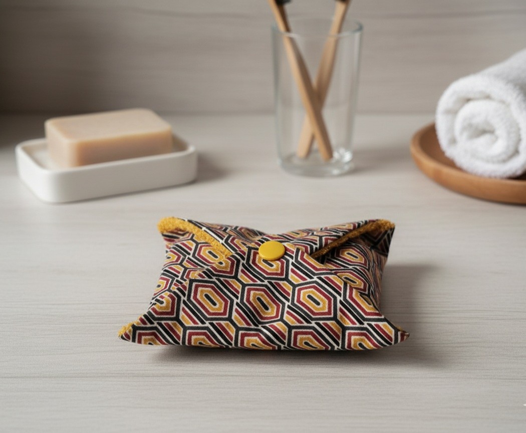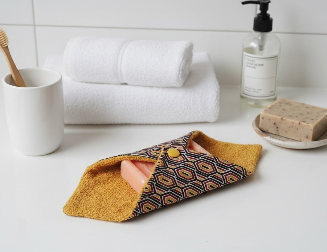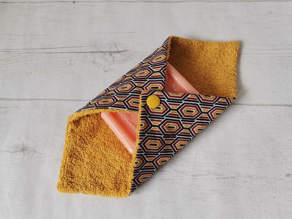 Pochette à savon coton imprimé et doublé éponge moutarde