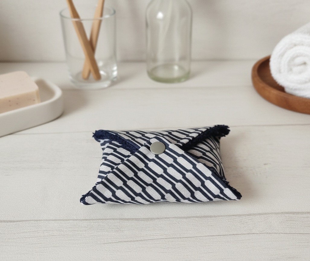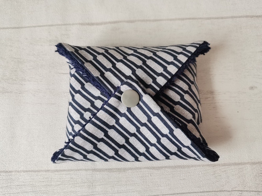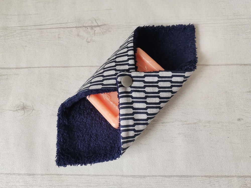 Très jolie pochette à savon ou shampoing solide qui se ferme à l’aide d’un bouton pression.