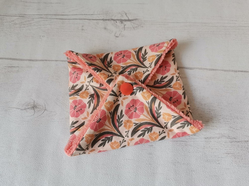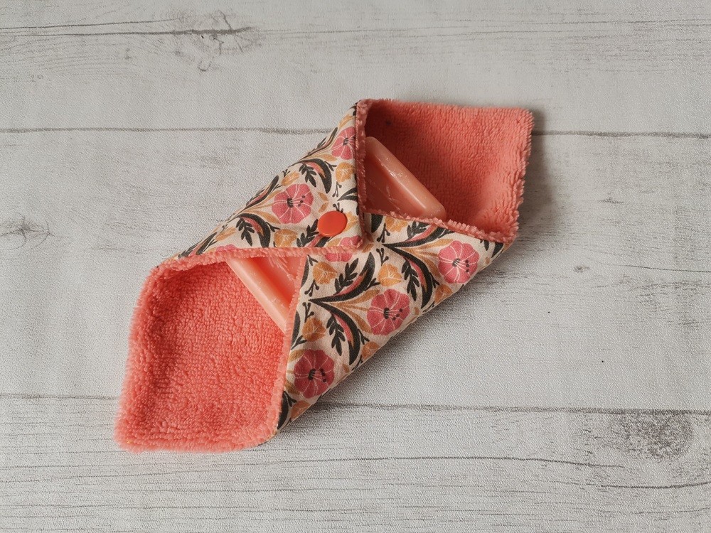 Pochette à savon coton imprimé fleurs et doublé éponge orange