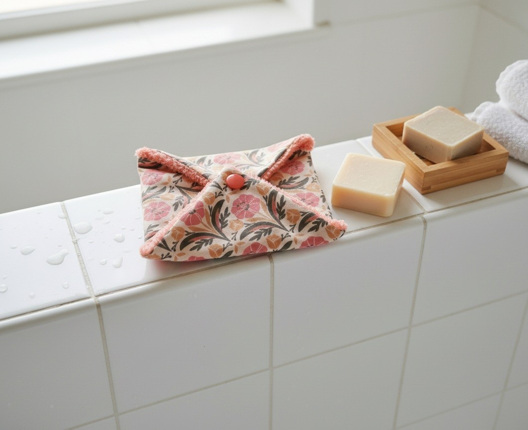Très jolie pochette à savon ou shampoing solide qui se ferme à l’aide d’un bouton pression.