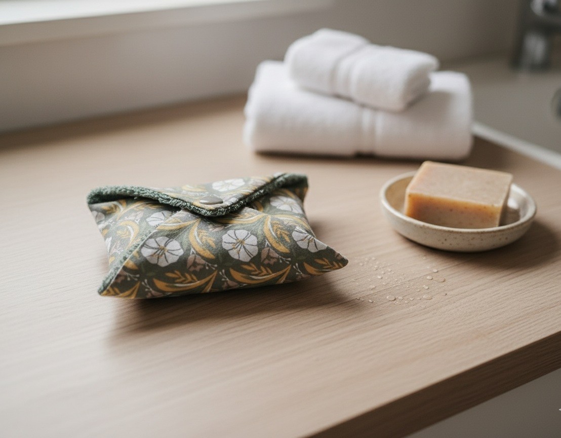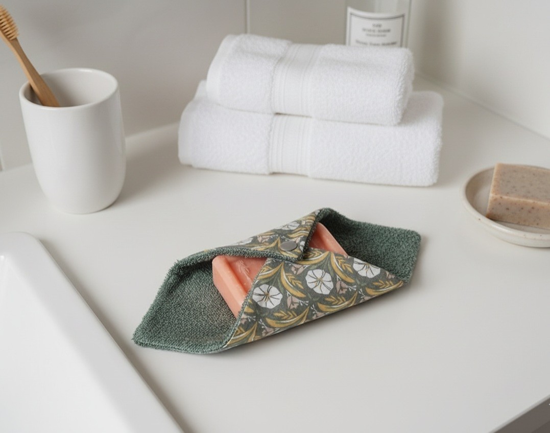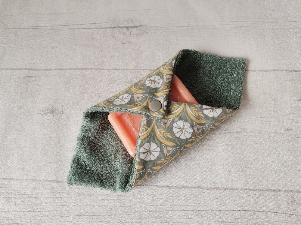 Pochette à savon coton imprimé fleurs et doublé éponge vert