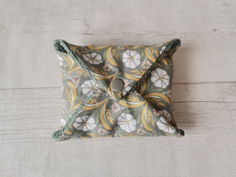 Très jolie pochette à savon ou shampoing solide qui se ferme à l’aide d’un bouton pression.