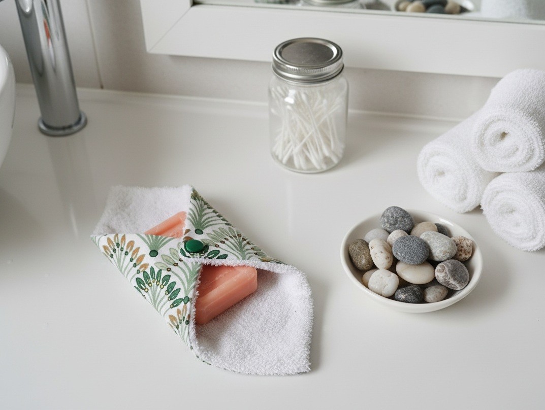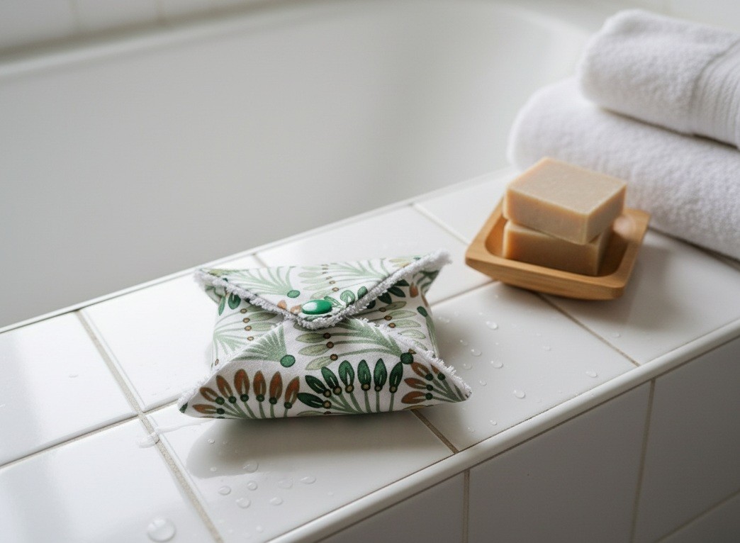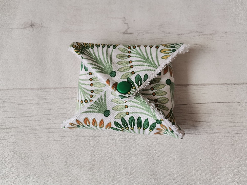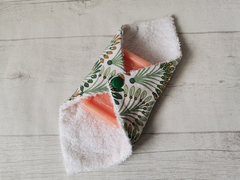 Pochette à savon coton imprimé fleurs vertes et doublé éponge blanche