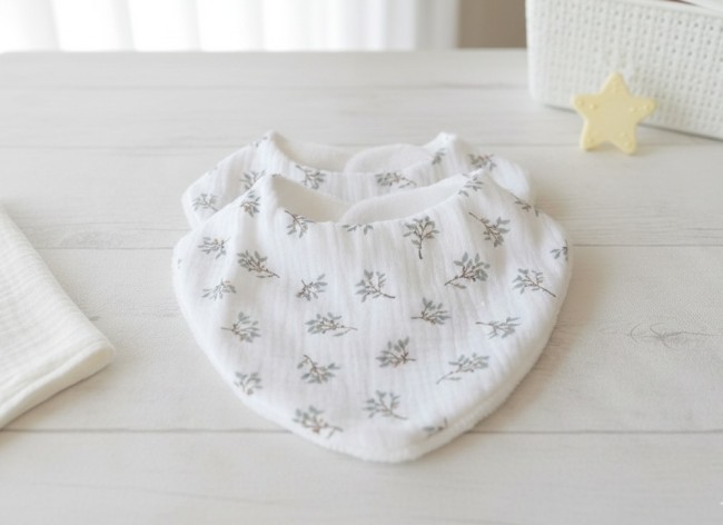 Réalisé avec du tissu double gaze de couleur blanc imprimé feuilles et doublé avec un tissu éponge bambou de couleur blanche