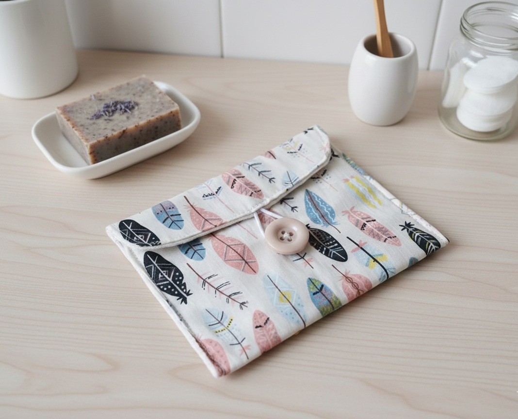 Pochette à rabat, fermeture par bouton et élastique , extérieur en coton certifié Oeko-Tex et intérieur en nid d'abeilles de couleur beige