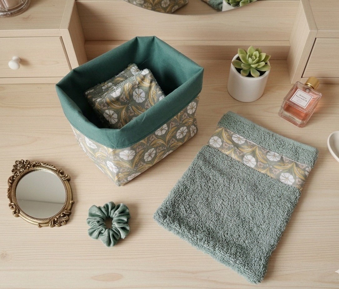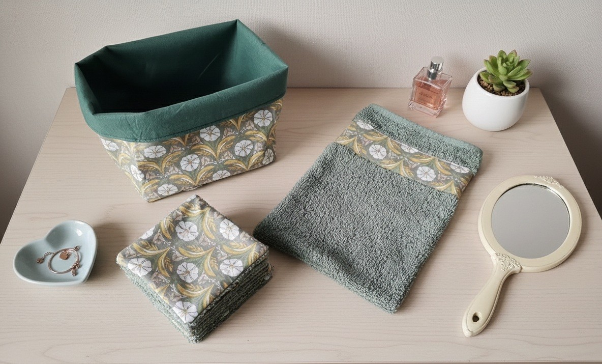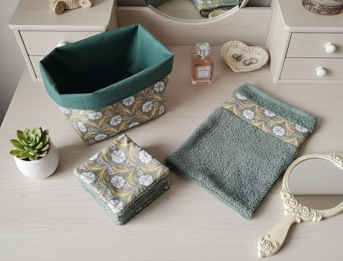 Ensemble d'un petit panier et ses 8 lingettes démaquillantes et gant de toilette assorties