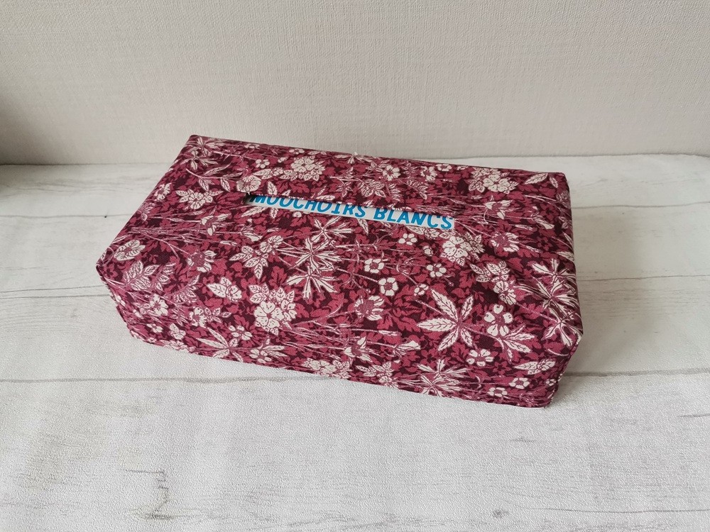 Housse pour boite à mouchoirs coton grenat motifs fleurs blanches