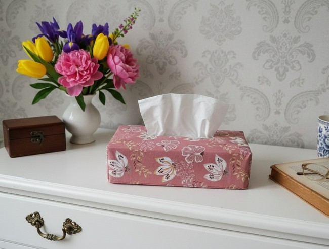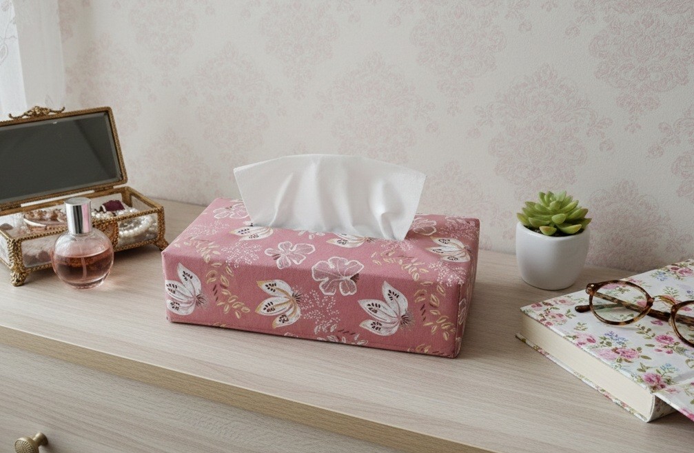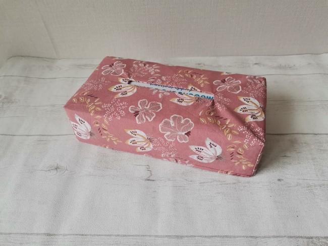 Housse pour boite à mouchoirs coton vieux rose motifs fleurs blanches