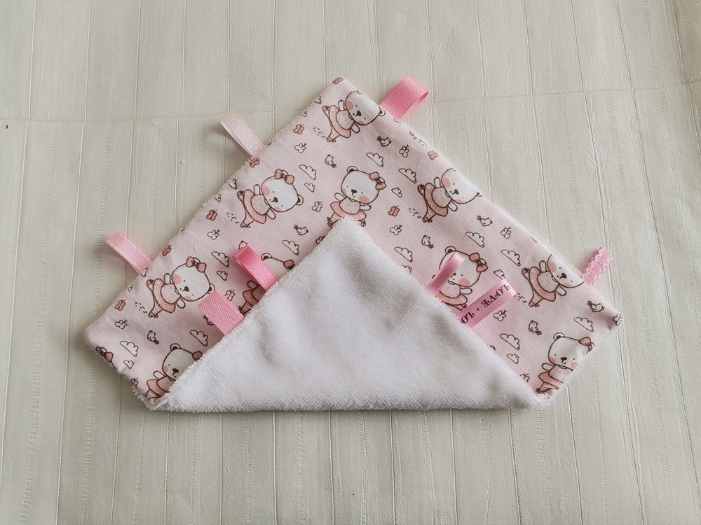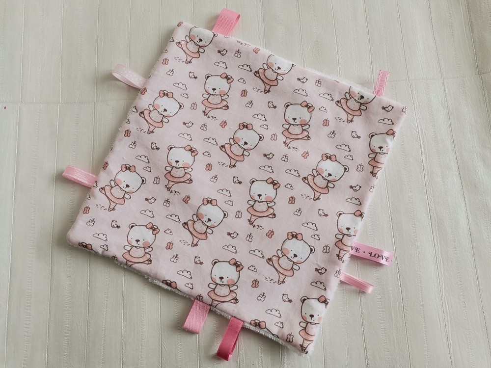 Doudou plat carré coton motif oursonnes danseuses et éponge bambou blanche