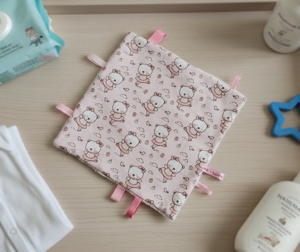 Doudou carré étiquettes parfait pour l'éveil de bébé .