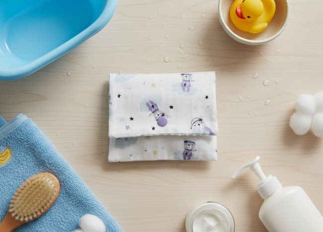 Pochette à rabat, fermeture par bouton préssion , extérieur en coton certifié Oeko-Tex imprimé et intérieur en coton nid d'abeilles
