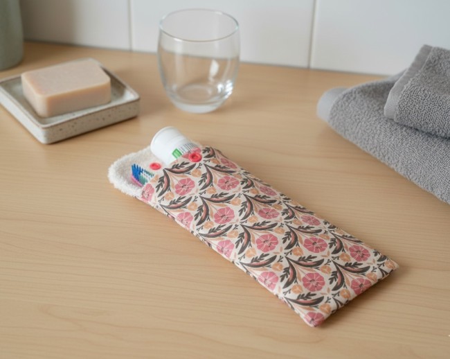 Emportez en voyage votre brosse à dents et votre dentifrice dans cet étui. L'intérieur est en tissu éponge de couleur beige pour protéger vos affaires de l'humidité. Le tissu principal est 100% coton certifié Oeko-Tex.