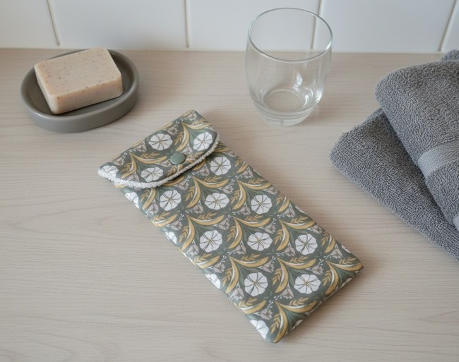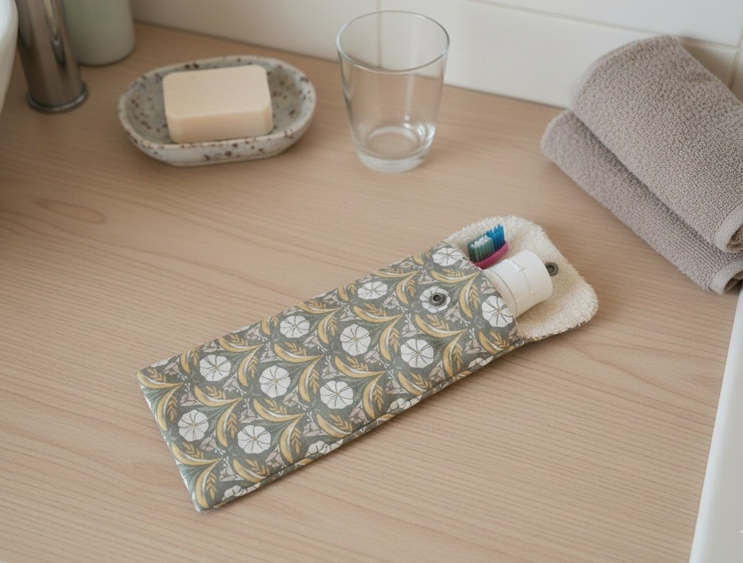 Emportez en voyage votre brosse à dents et votre dentifrice dans cet étui. L'intérieur est en tissu éponge de couleur beige pour protéger vos affaires de l'humidité. Le tissu principal est 100% coton certifié Oeko-Tex.