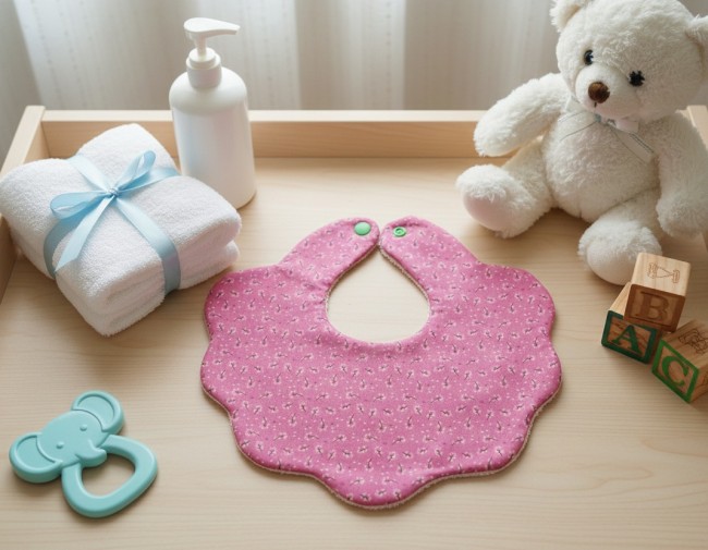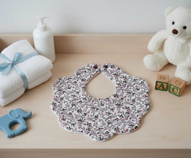 Elle est composée d'une superposition de 3 couches de tissus, face extérieure en coton blanc imprimé certifié Oeko-Tex, face intérieure en coton uni de couleur vert clair, feutrine verte et feutrine rose, fermeture pression , elle mesure : 9 x 10.5 cm fermée et 10.5 x 24 cm au plus haut dépliée