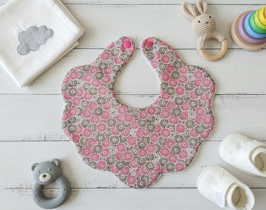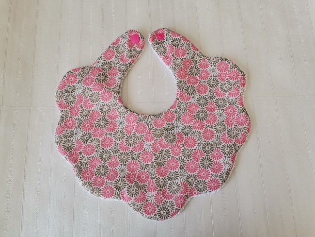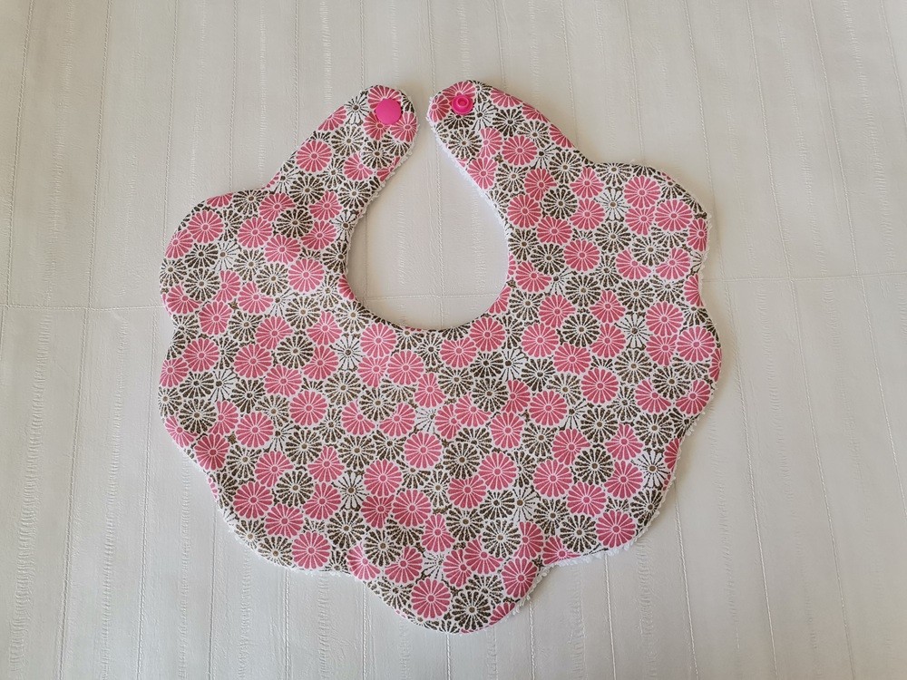 Bavoir bébé forme fleur coton blanc motifs fleurs rose et marron et éponge blanche