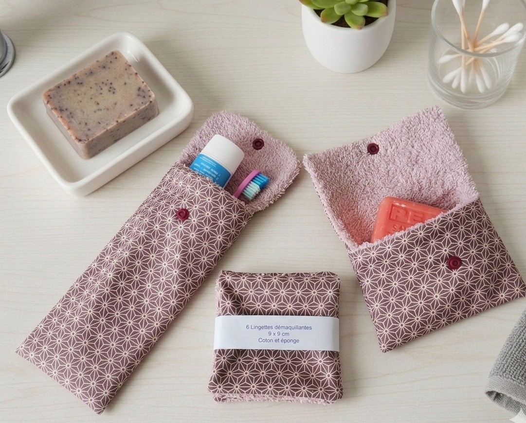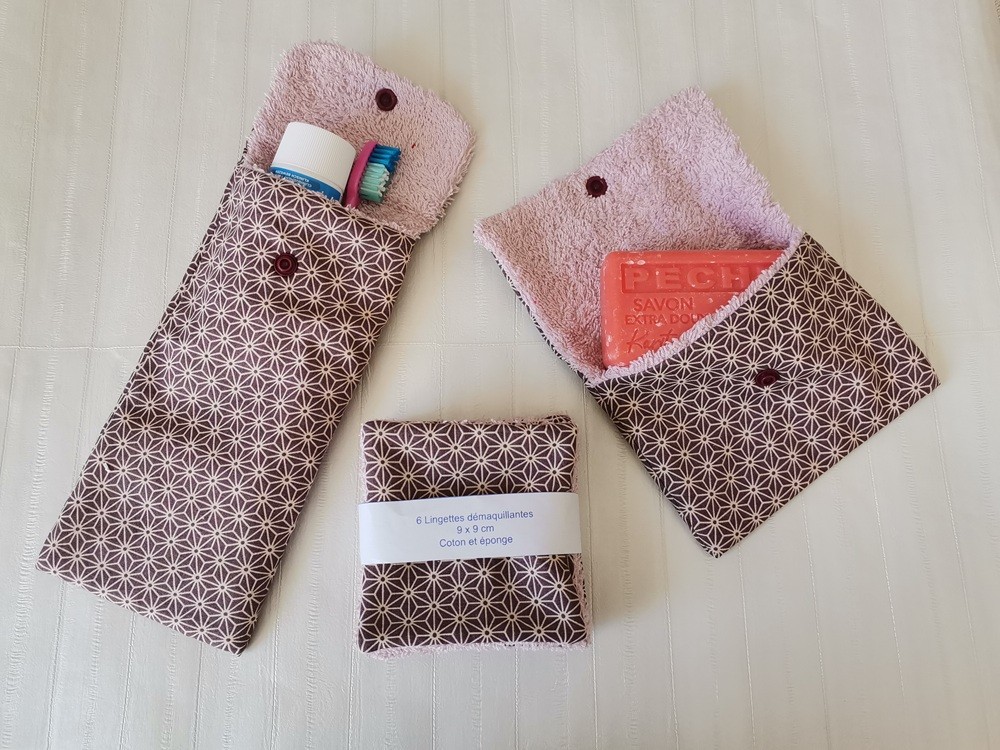 Ensemble toilette composé d'un étui brosse et dent et dentifrice, d'une pochette à savon et 6 lingettes démaquillantes