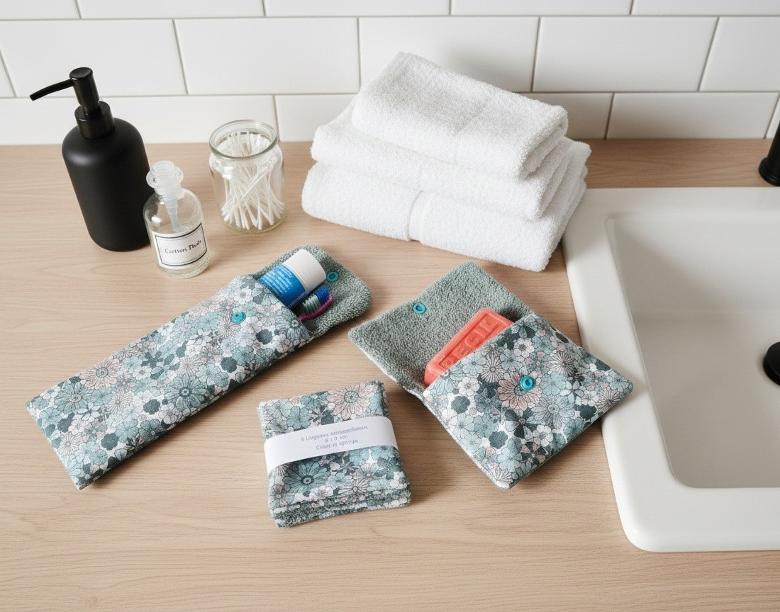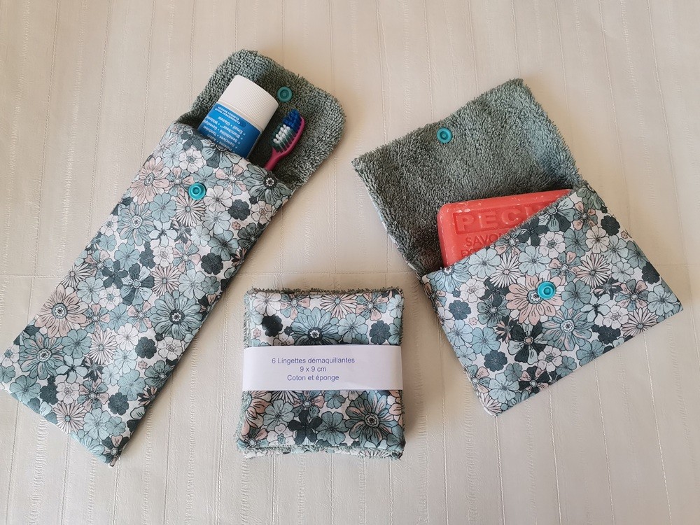 Ensemble toilette composé d'un étui brosse et dent et dentifrice, d'une pochette à savon et 6 lingettes démaquillantes