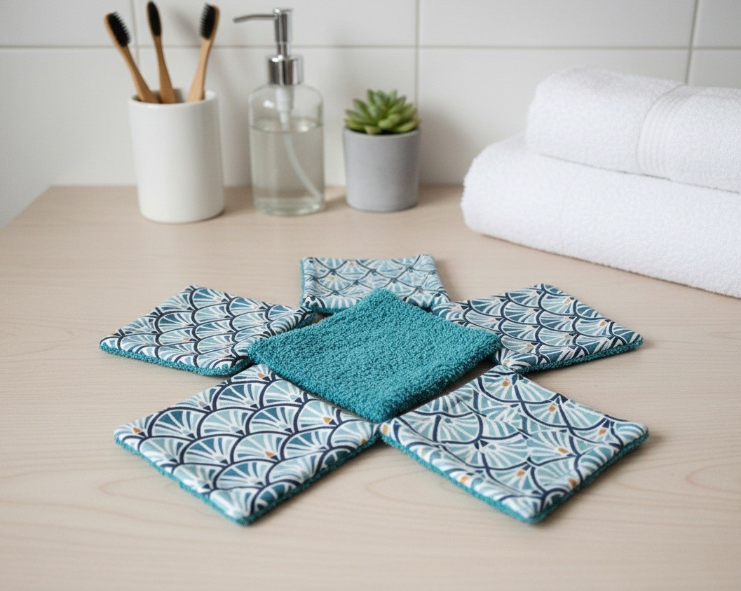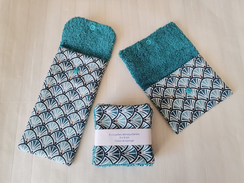 Réalisé dans un coton imprimé certifié Oeko-Tex et doublé en éponge de couleur turquoise