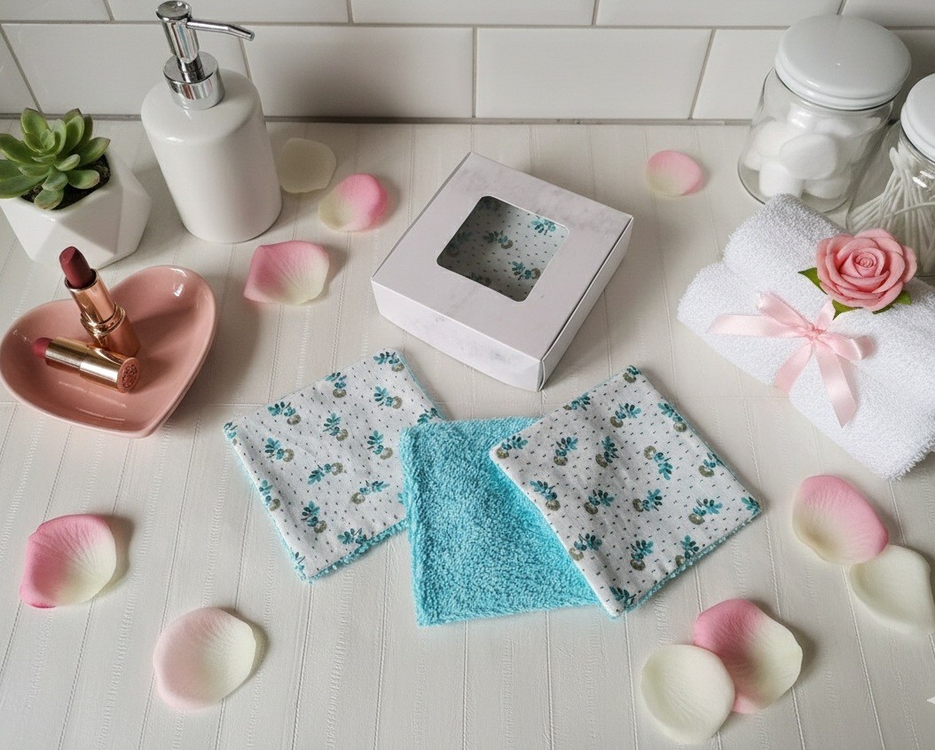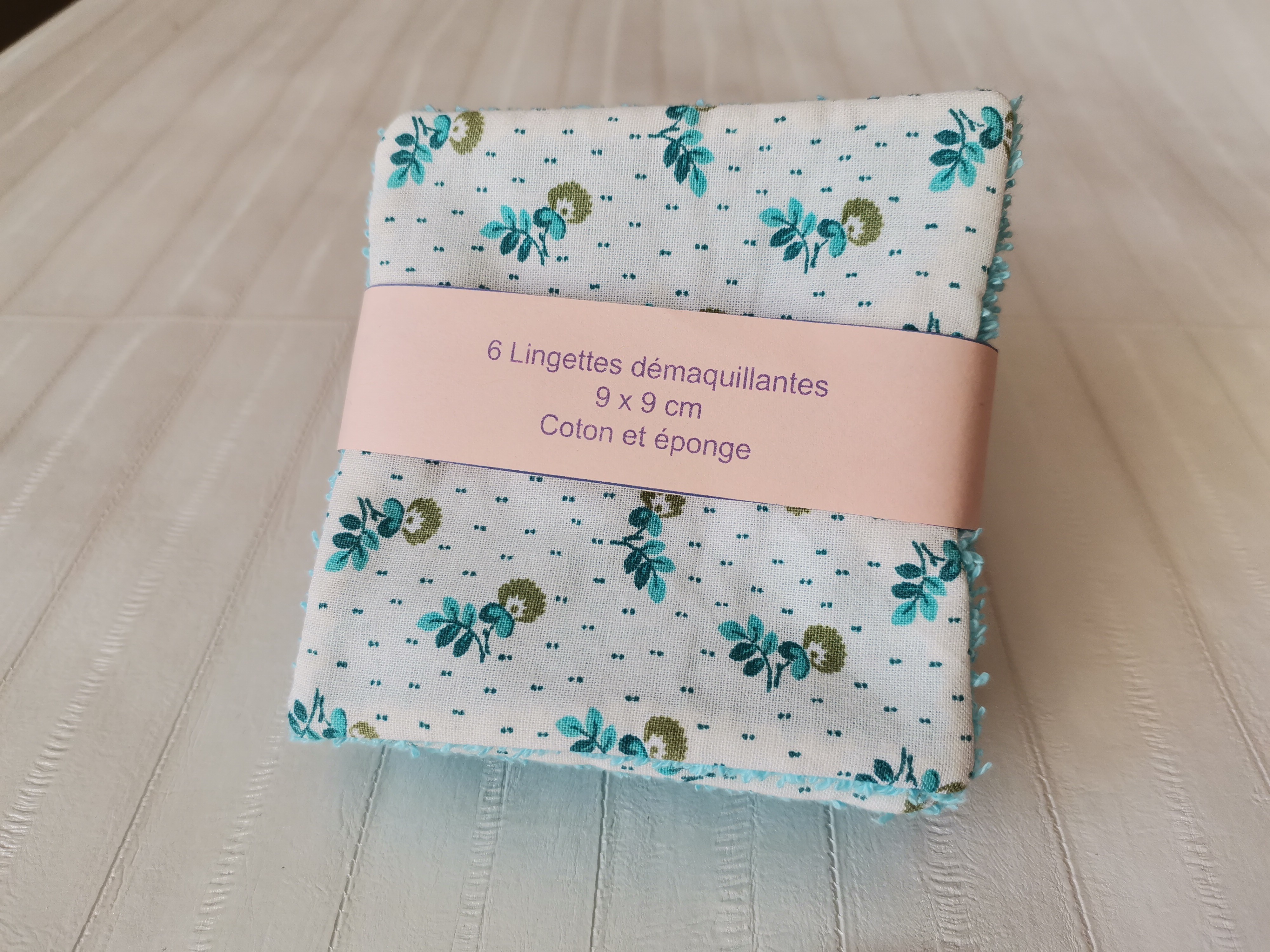 Boite de 6 lingettes démaquillantes coton imprimé et éponge bleu clair