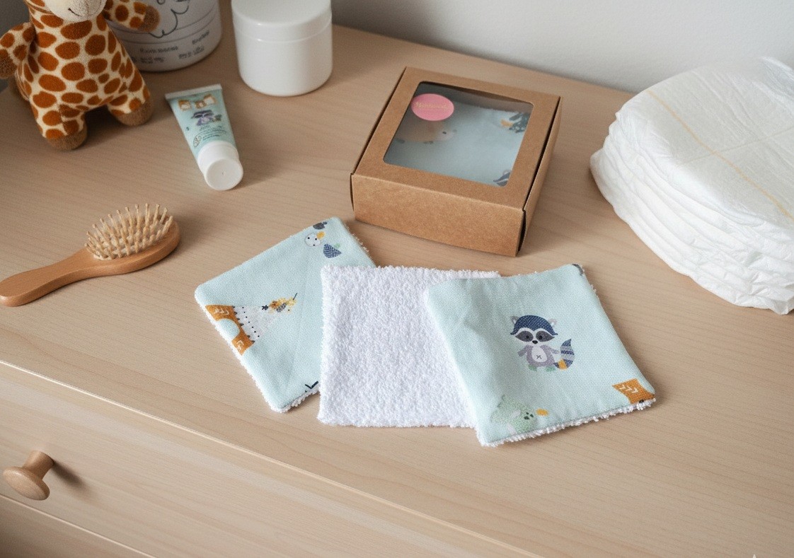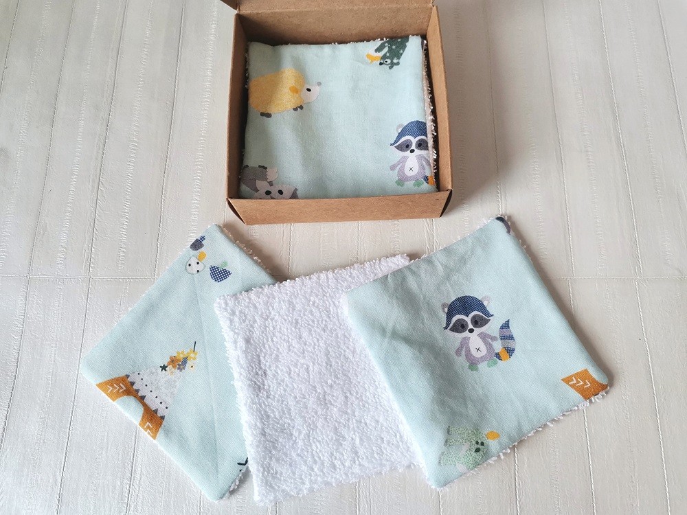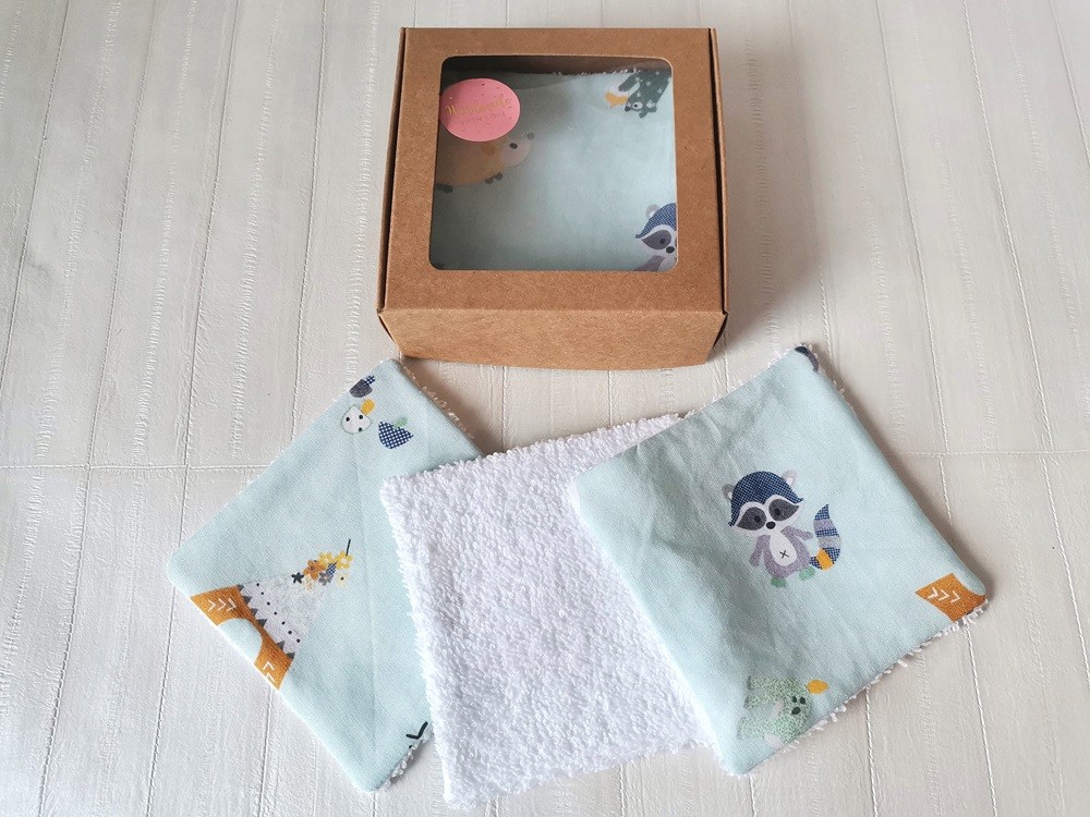 Un peu de douceur pour le change de bébé avec ce lot de 6 lingettes lavables dans leur boite cadeau