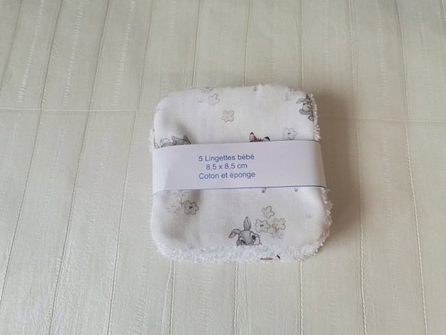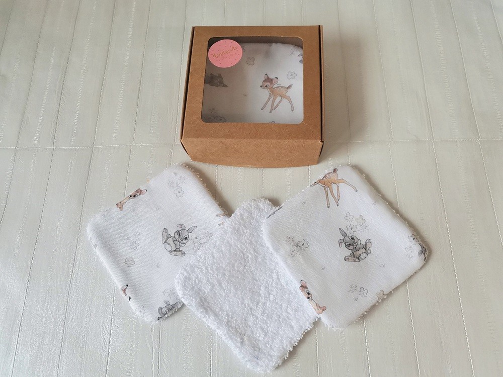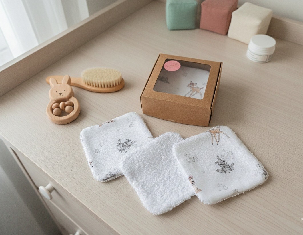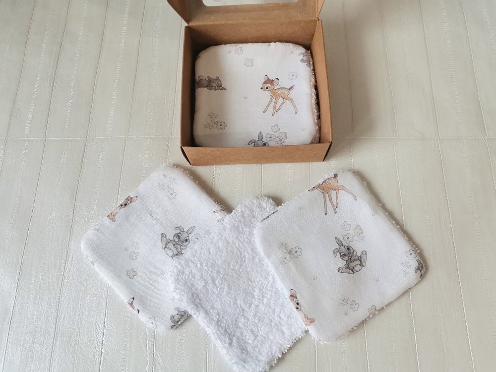Un peu de douceur pour le change de bébé avec ce lot de 5 lingettes lavables dans leur boite cadeau