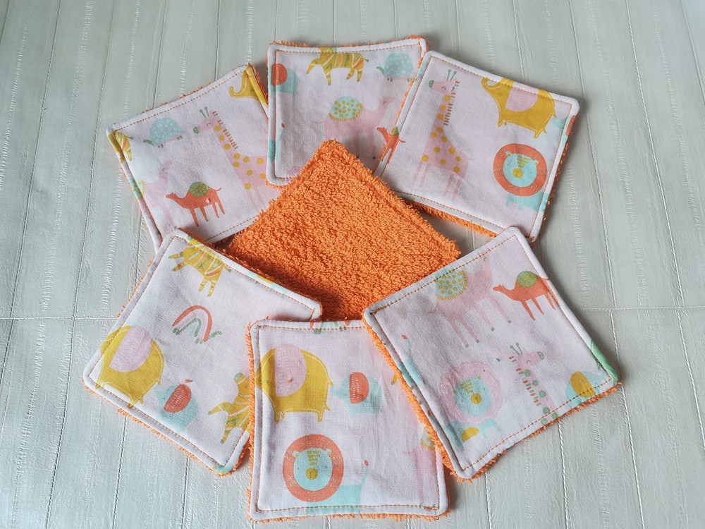 Une face coton certifié Oeko-Tex motifs animaux et l'autre face en tissu éponge de couleur orange