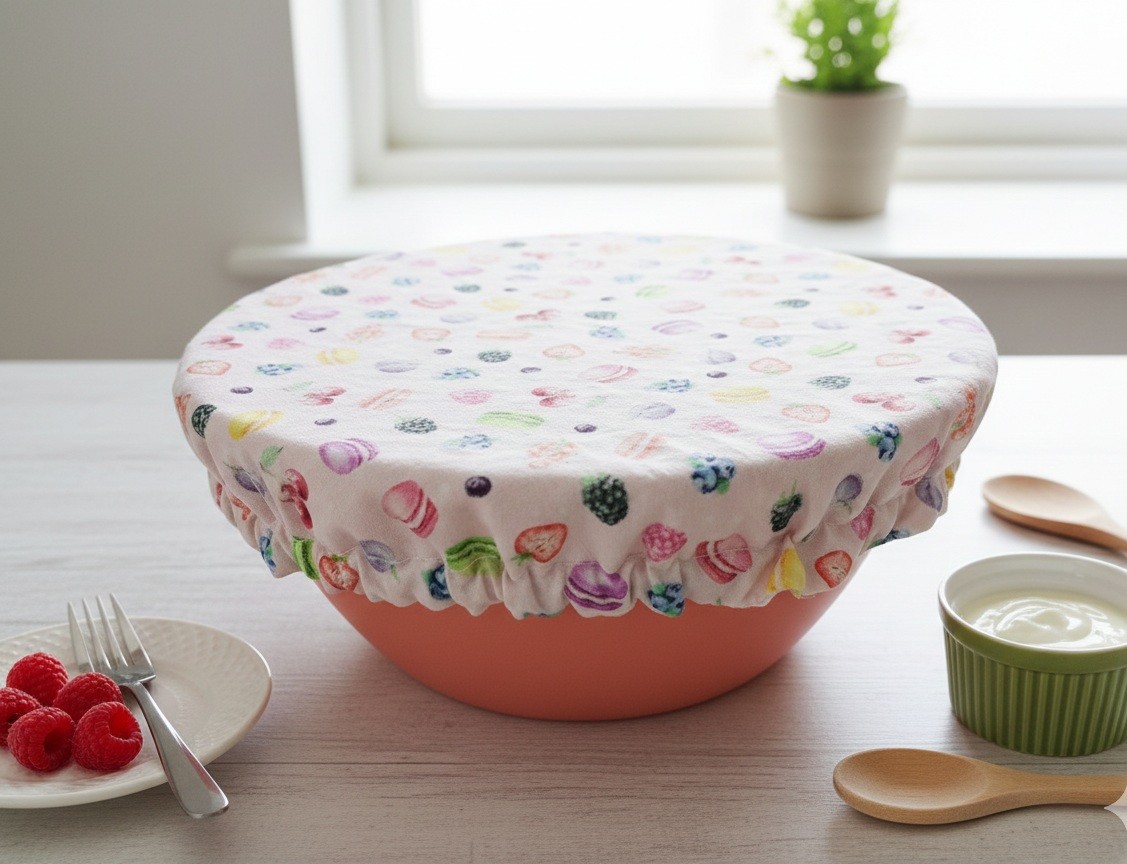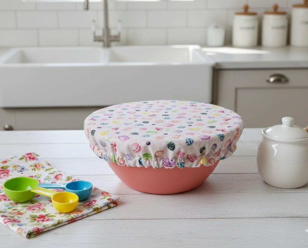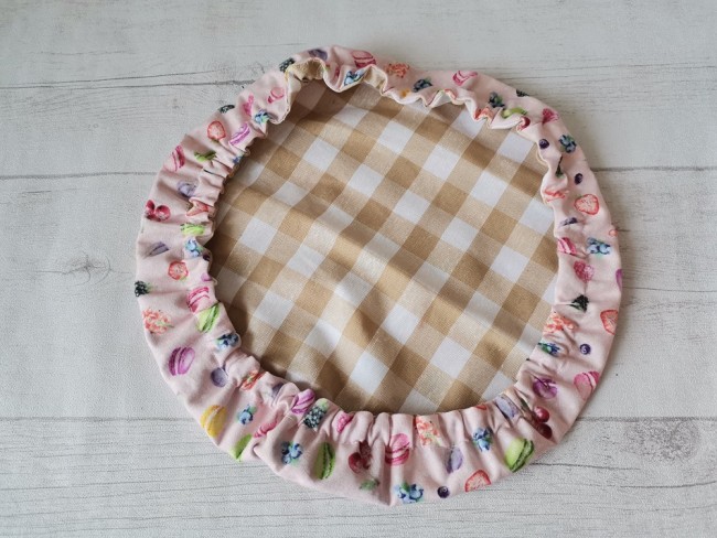 Charlotte alimentaire/couvre plat réalisé avec du tissu coton certifié Oeko-Tex motif macarons sur fond rose et doublé en tissu coton enduit conçu pour un contact alimentaire sans transfert de substances nocives.