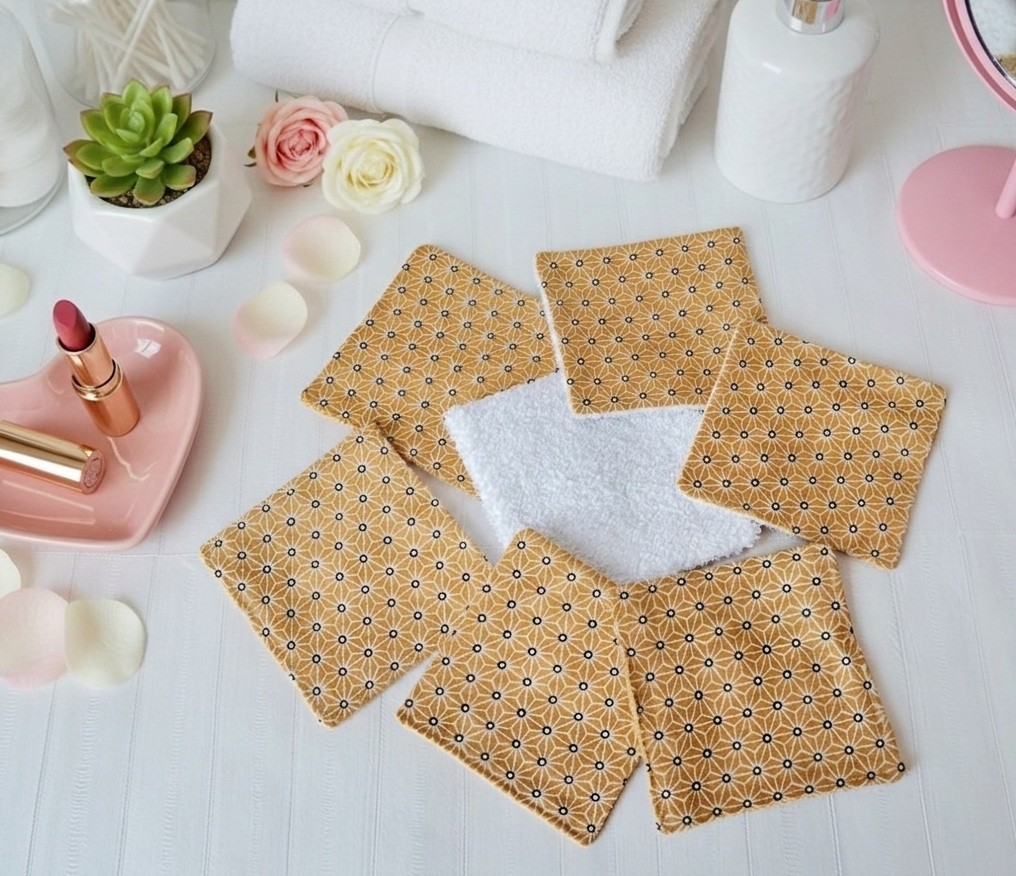 Boite de 6 lingettes démaquillantes coton imprimé moutarde et éponge blanche