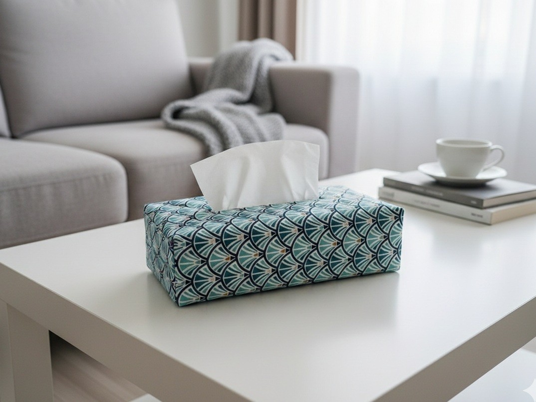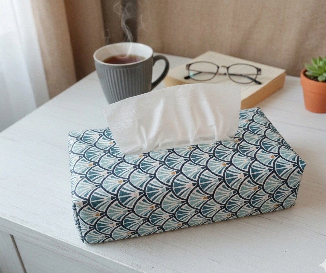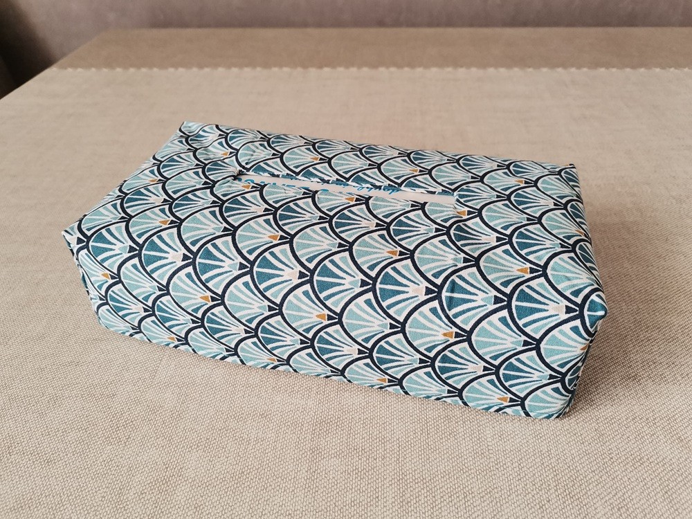 Housse pour boite à mouchoirs coton bleu turquoise motifs éventails