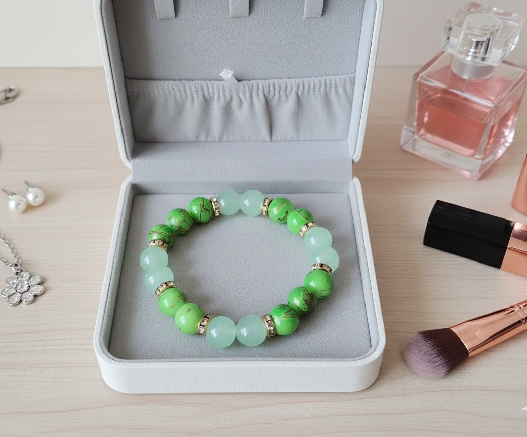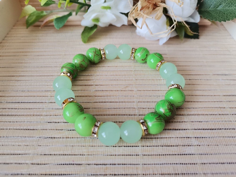 Bracelet sur fil élastique avec perles en verre imitation jade vert pale de 10 mm et vert tréfilé avec perles strass intercalaires