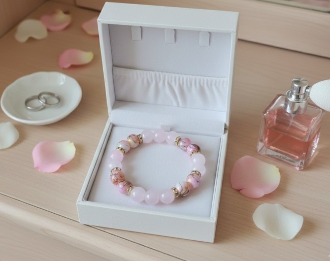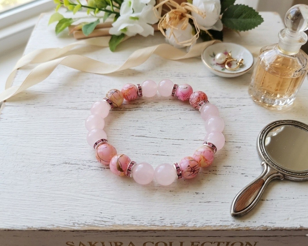Bracelet sur fil élastique avec perles en verre imitation jade rose pale de 10 mm et rose tréfilé avec perles strass intercalaires