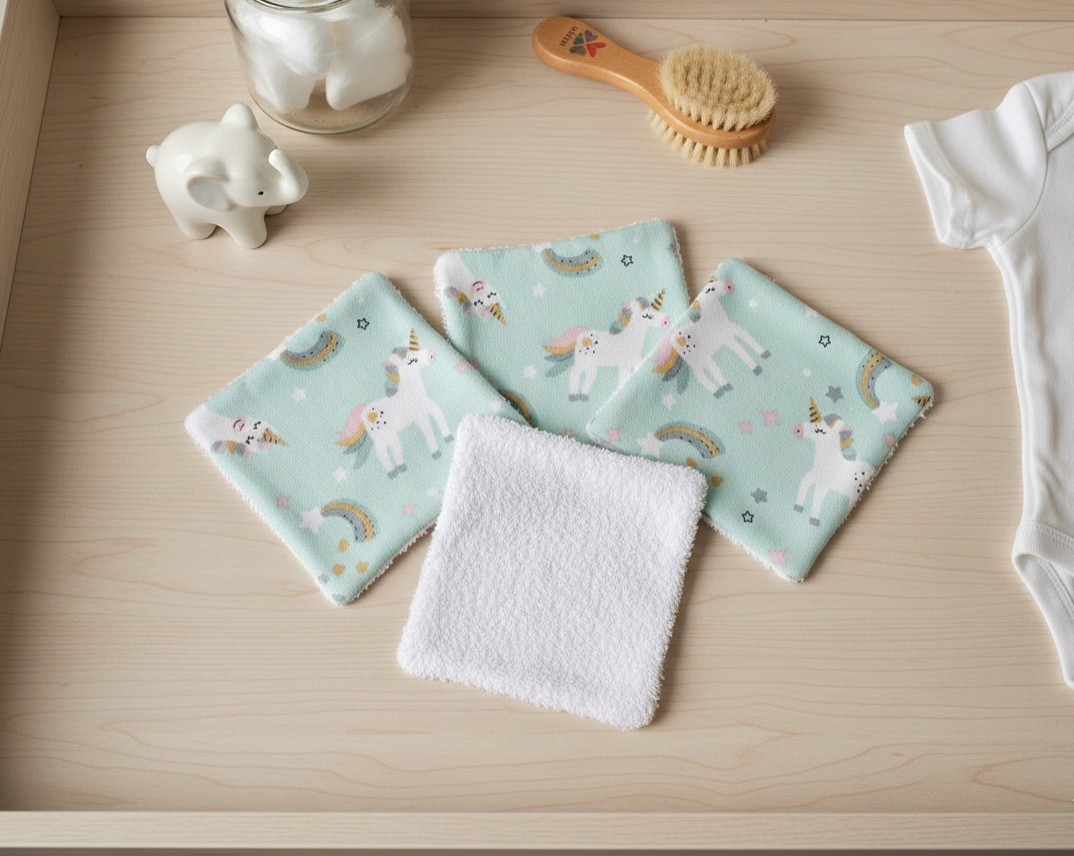 Un peu de douceur pour le change de bébé avec ce lot de 4 lingettes lavables dans leur boite cadeau