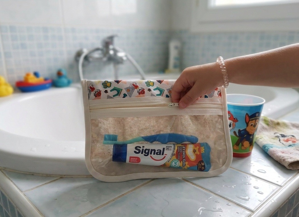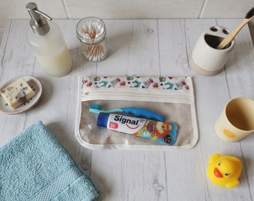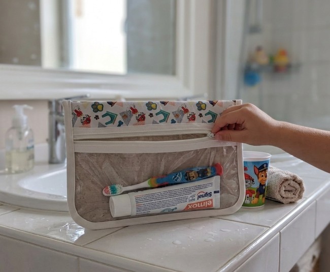 Emportez en voyage votre brosse à dents et votre dentifrice dans cette pochette. L'intérieur est en tissu coton enduit de couleur lin pour protéger vos affaires de l'humidité. Le tissu principal est 100% coton certifié Oeko-Tex imprimé Pat Patrouille.
