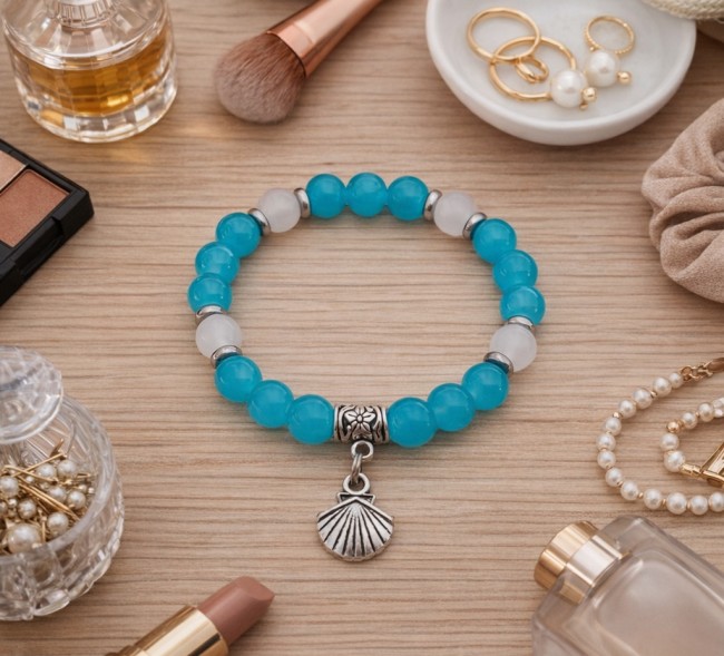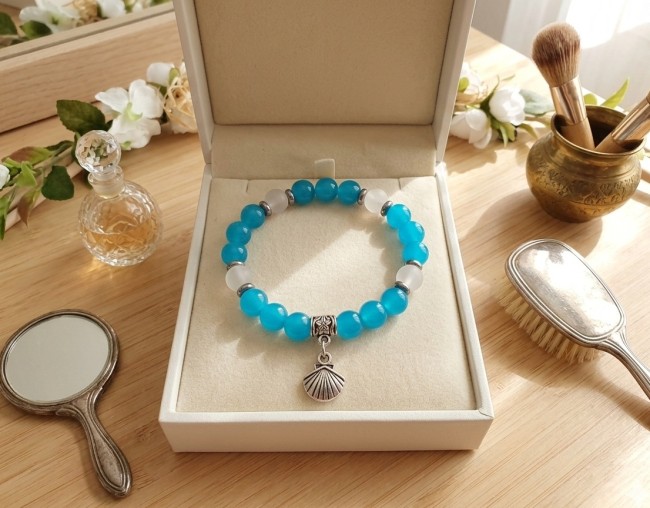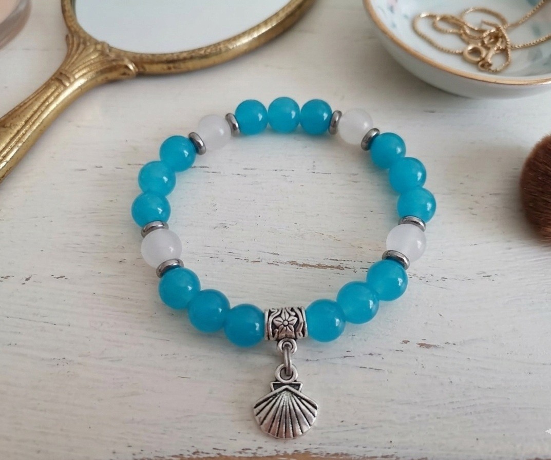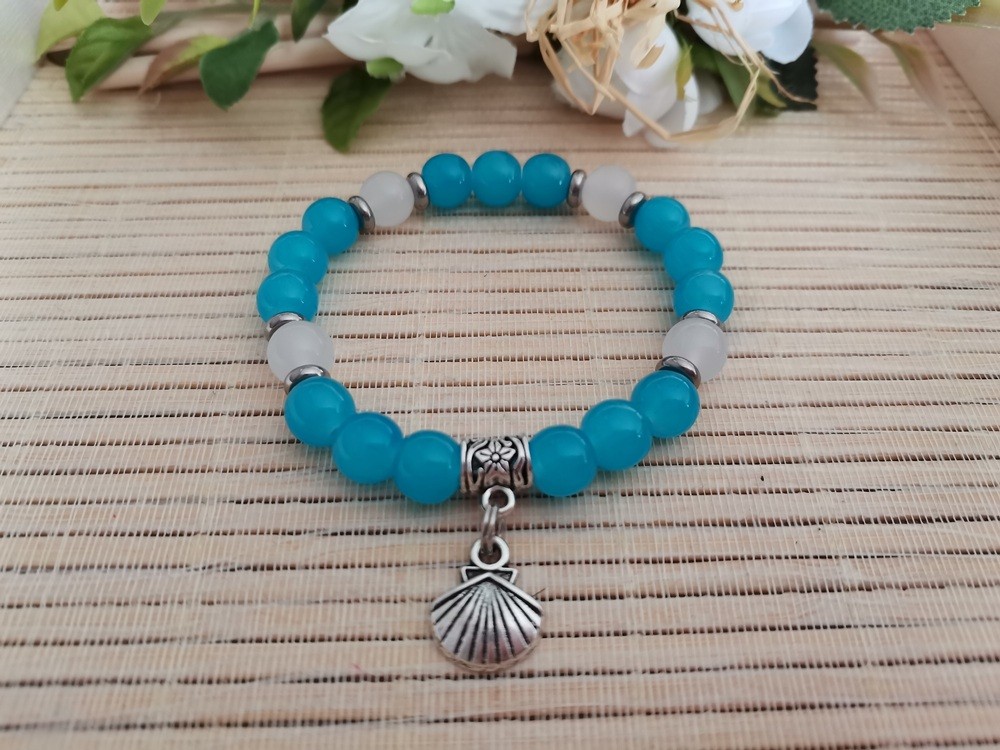 Bracelet sur fil élastique composé de perles en verre 8 mm bleues et blanches transparentes, perles intercalaires rondelle acier inoxydable et bélière avec breloque coquillage