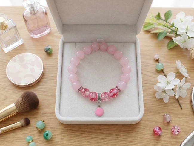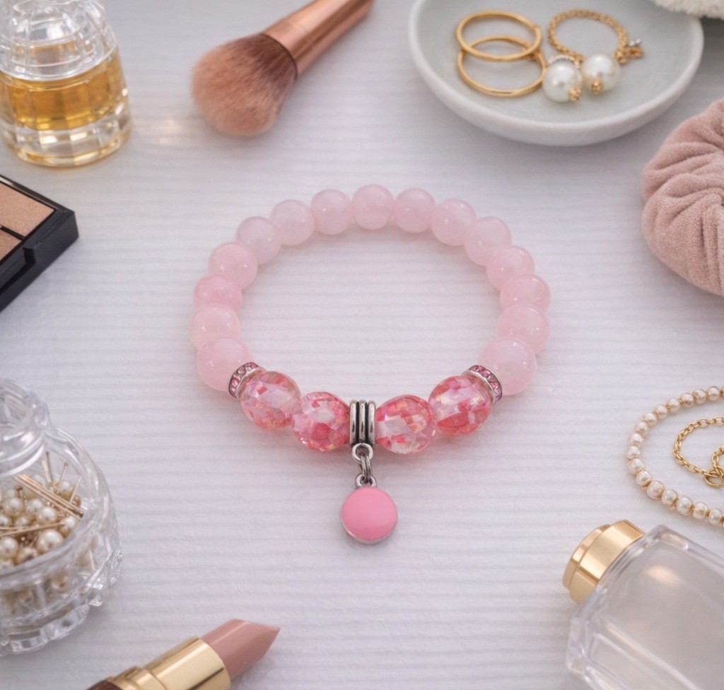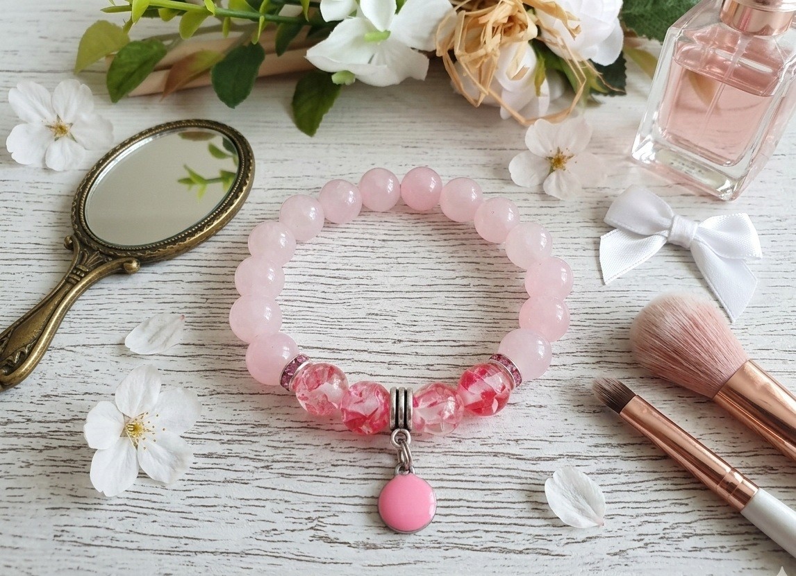 Bracelet perles en verre imitation jade rose et breloque ronde