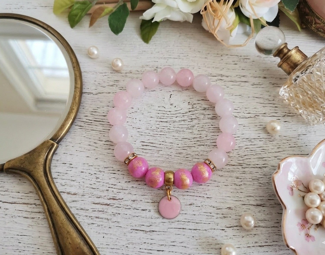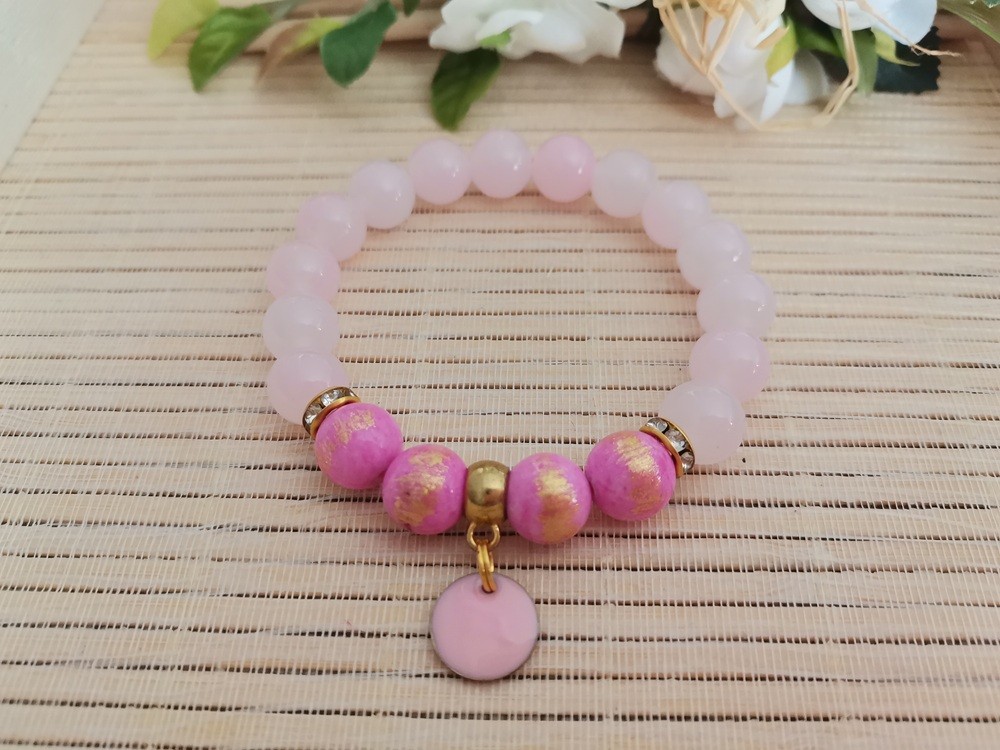 Bracelet sur fil élastique avec perles en verre imitation jade rose de 10 mm et rose taches dorées avec breloque émaillé rond rose
