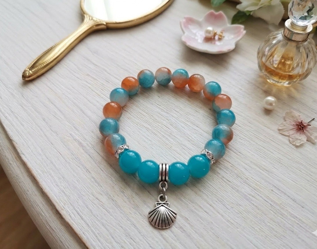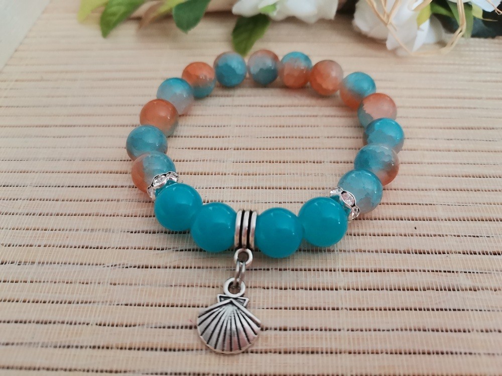 Bracelet sur fil élastique avec perles en verre imitation jade bleu turquoise de 10 mm et perles en verre bleu orange, perles rondelle strass avec breloque coquillage