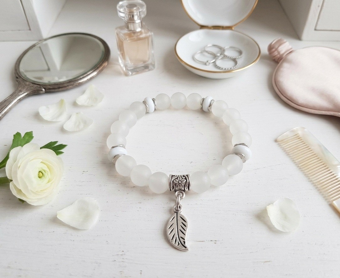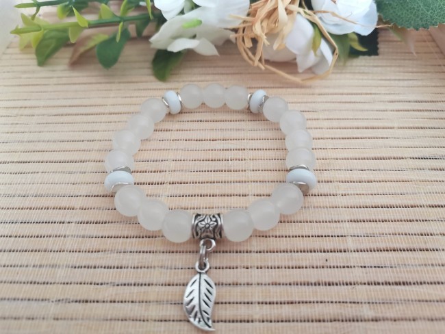 Bracelet sur fil élastique composé de perles en verre imitation jade 8 mm blanches, perles intercalaires ondulées argent mat et bélière avec breloque feuille