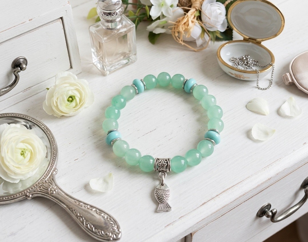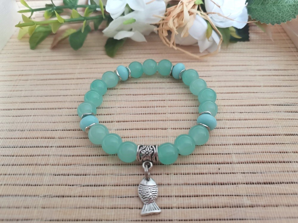 Bracelet sur fil élastique composé de perles en verre imitation jade 8 mm vert d'eau, perles intercalaires ondulées argent mat et bélière avec breloque poisson