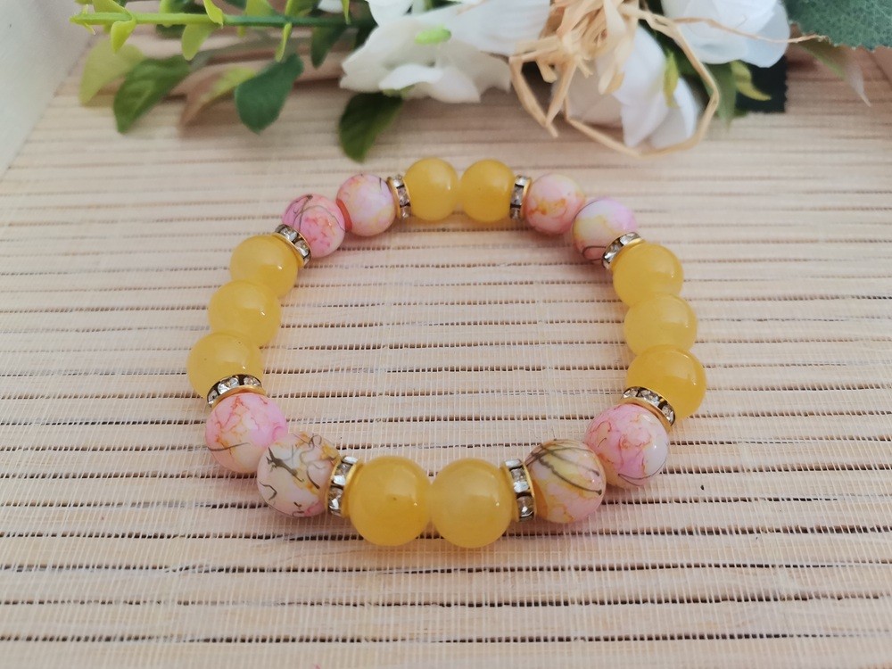 Bracelet sur fil élastique avec perles en verre imitation jade jaune de 10 mm et rose tréfilé avec perles strass intercalaires