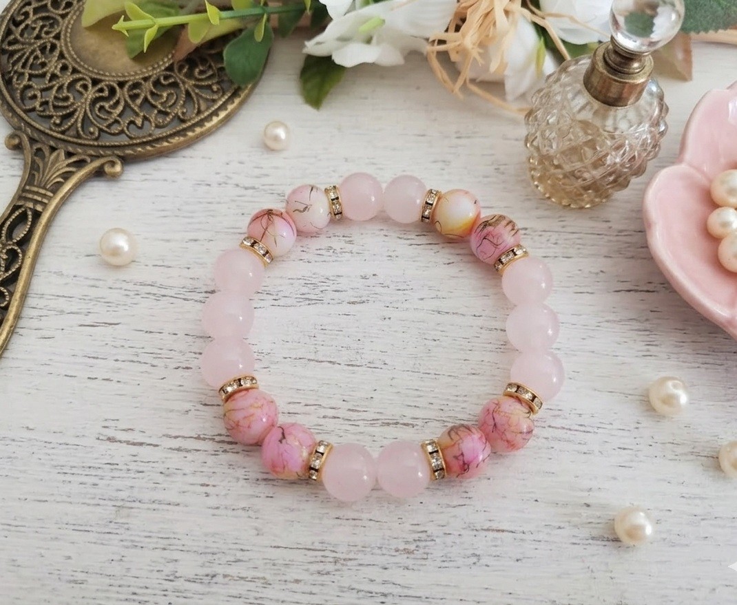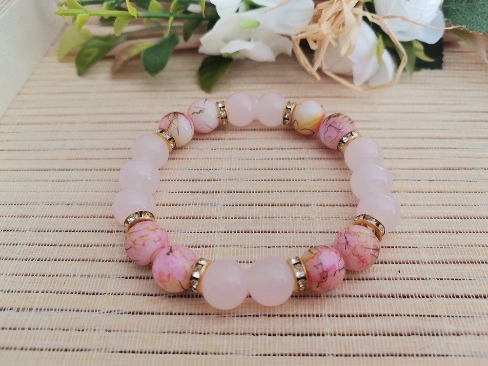 Bracelet sur fil élastique avec perles en verre imitation jade rose pale de 10 mm et rose tréfilé avec perles strass intercalaires