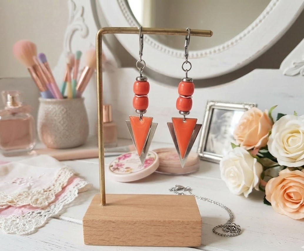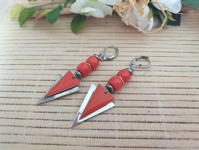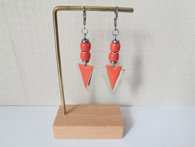 Boucles d'oreilles montées sur dormeuses à levier, avec perles en verre colonne et pendentifs triangle métal et émail
