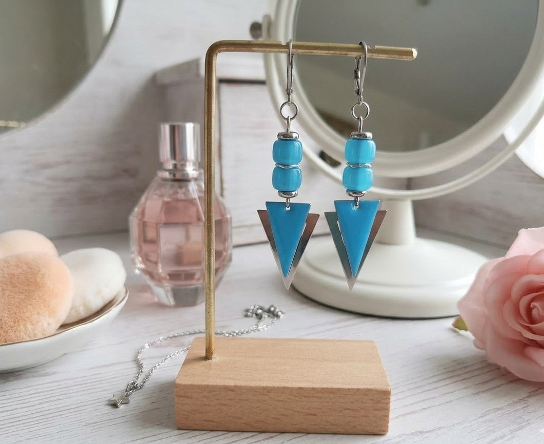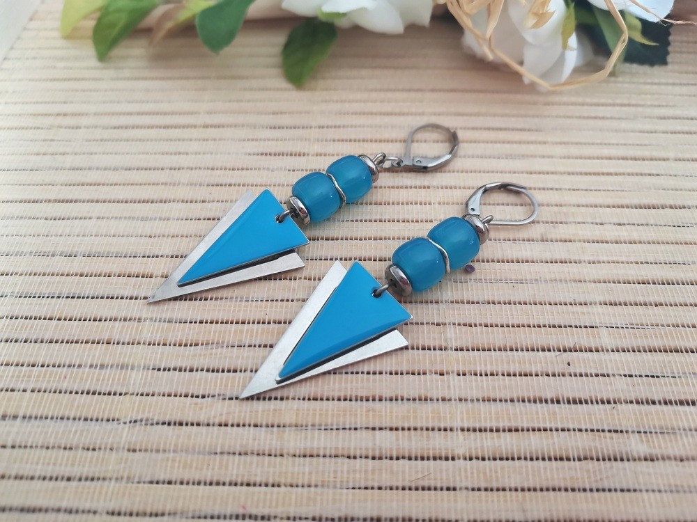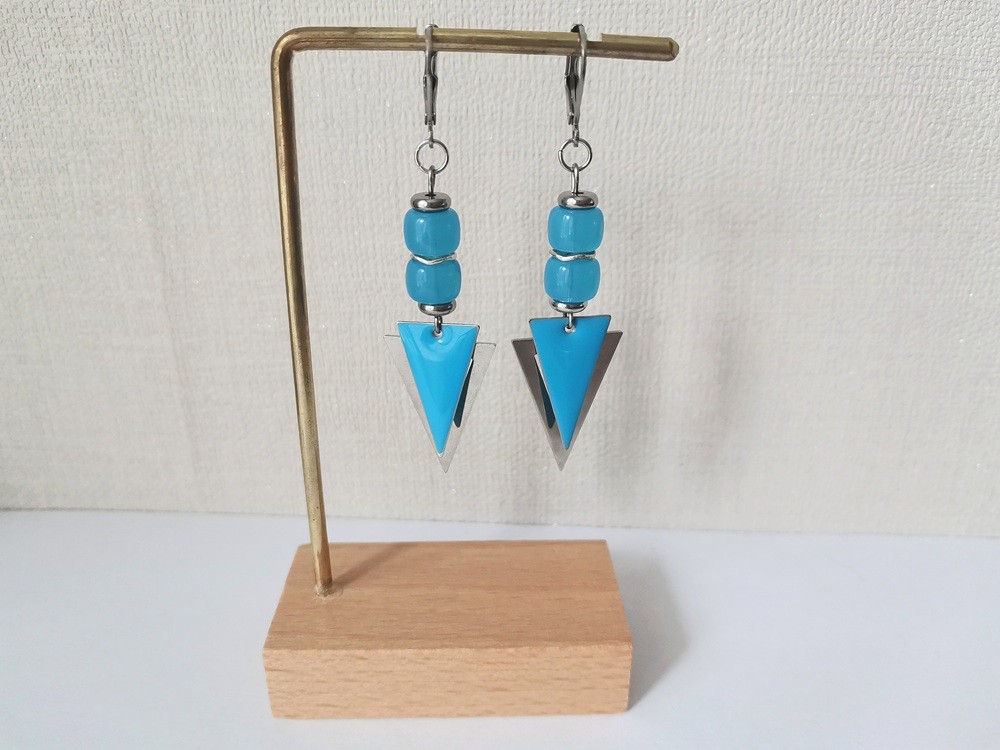 Boucles d'oreilles montées sur dormeuses à levier, avec perles en verre colonne et pendentifs triangle métal et émail