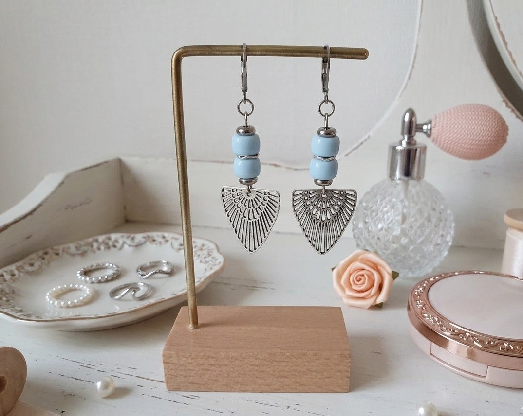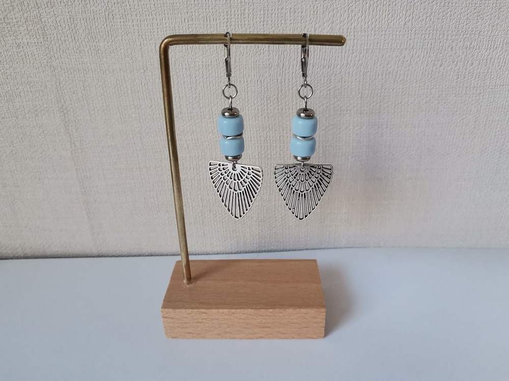 Boucles d'oreilles composées d'un pendentif forme aile en métal et de perles en verre colonne 8 mm