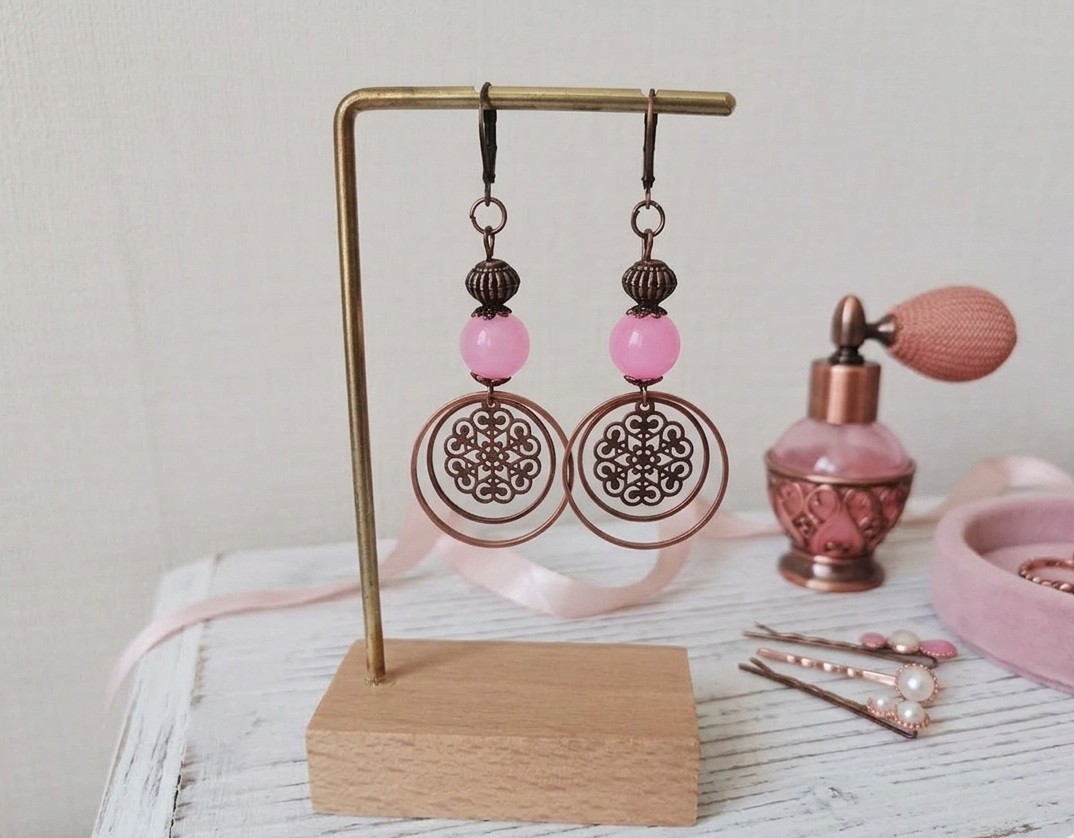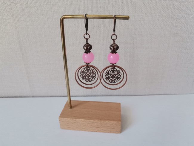 Boucles d'oreilles perles imitation jade rose et anneaux cuivre rouge