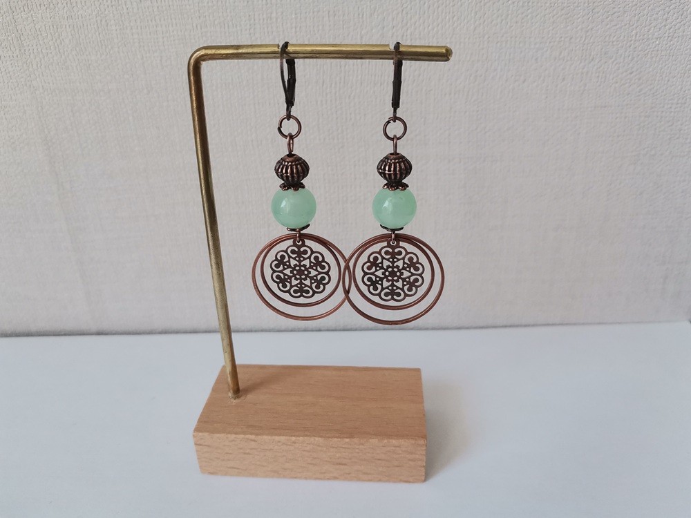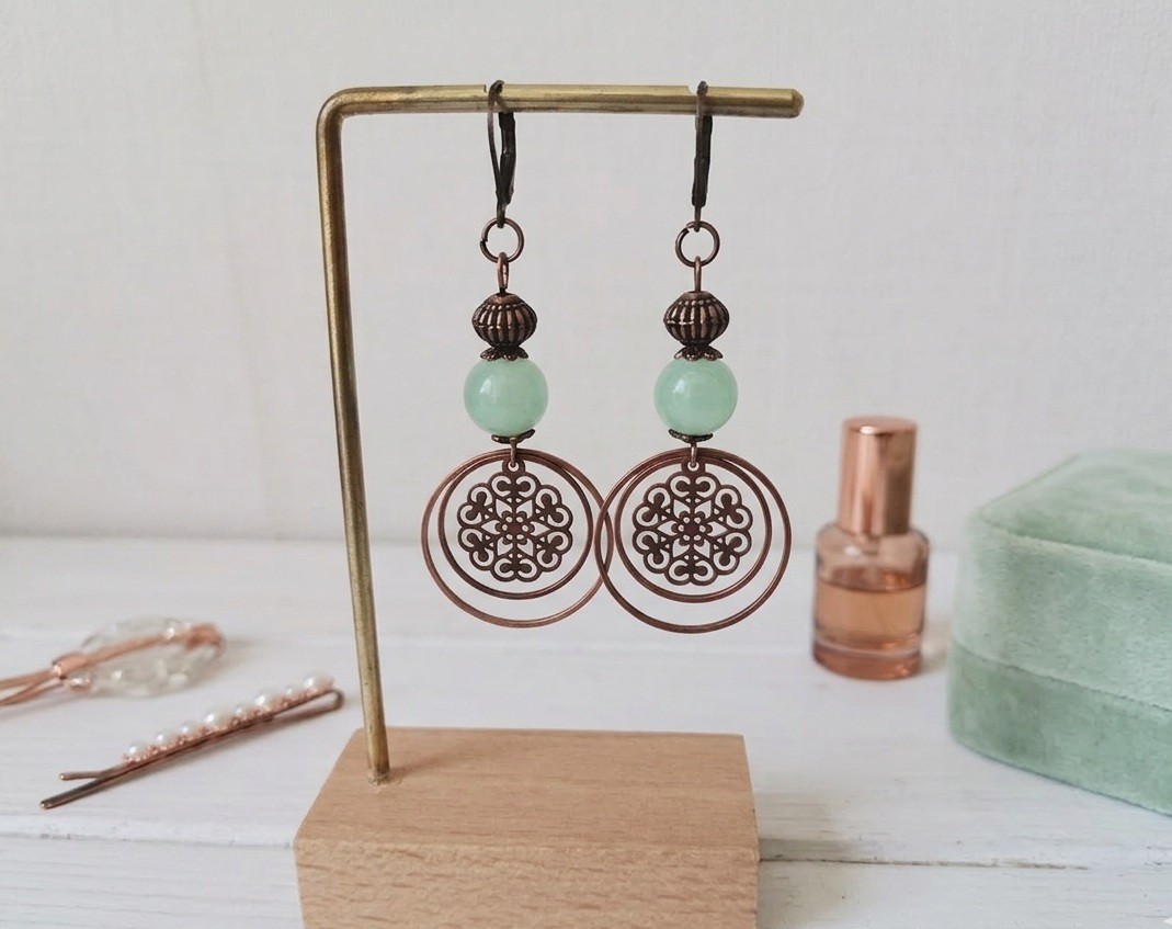 Boucles d'oreilles perles imitation jade vert d'eau et anneaux cuivre rouge