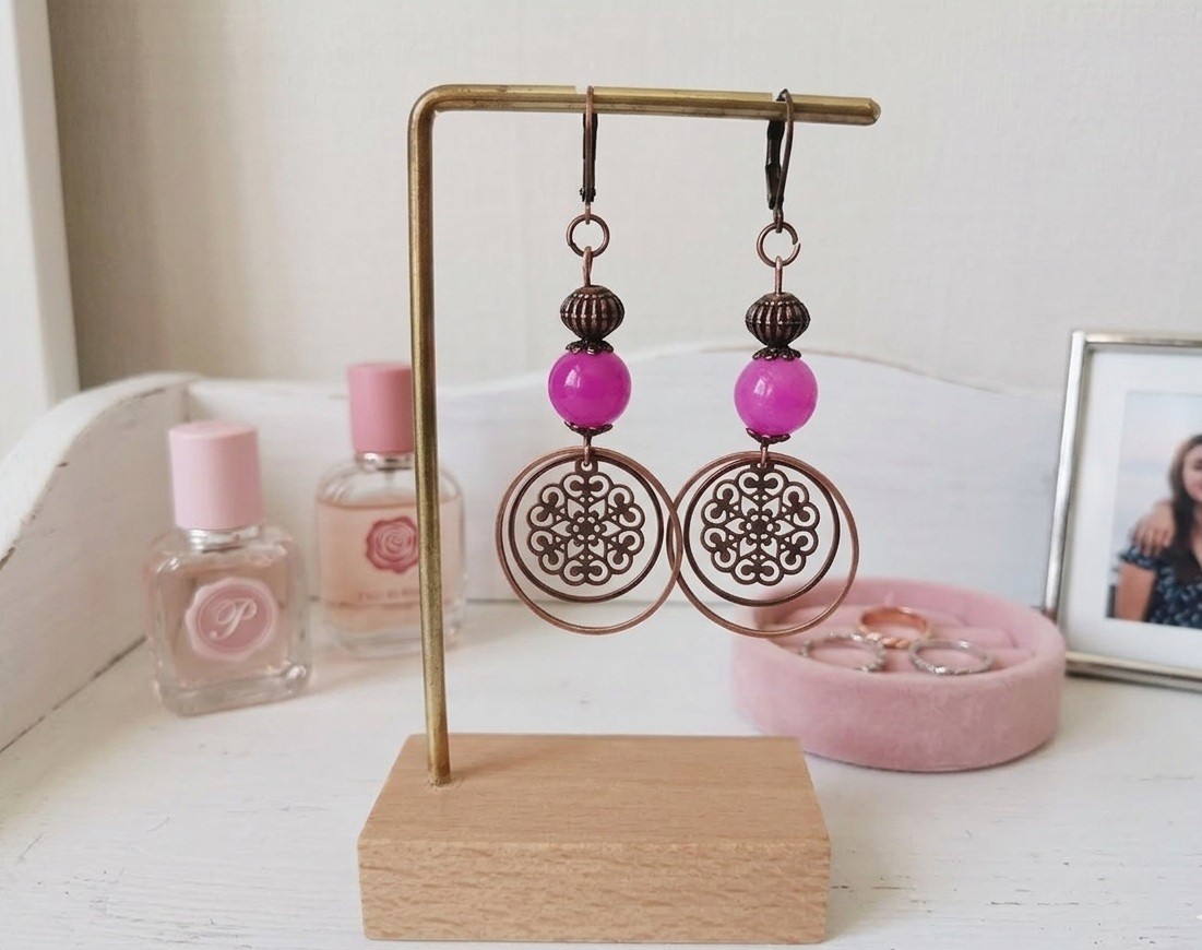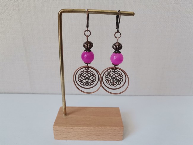 Boucles d'oreilles perles imitation jade violette et anneaux cuivre rouge