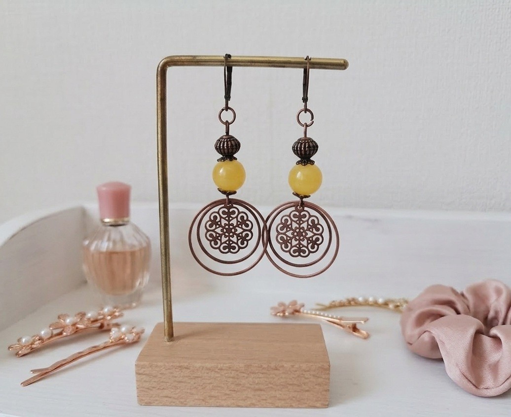 Boucles d'oreilles perles imitation jade jaune moutarde et anneaux cuivre rouge